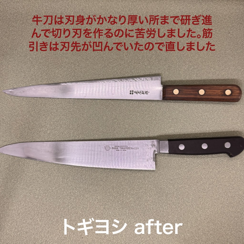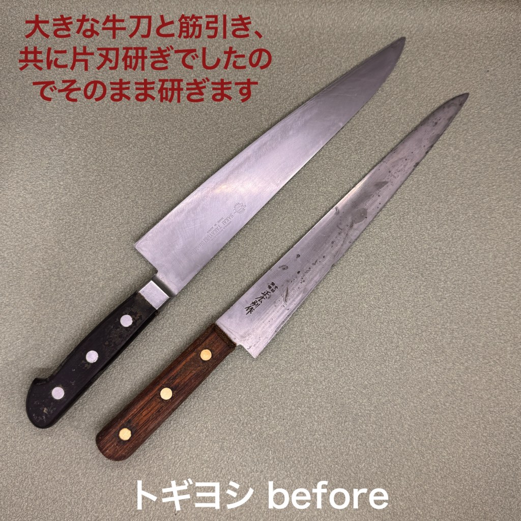 この2本を研ぎ上げました。牛刀と筋引き。お仕事で使われているのかなと思われます。刃は綺麗でしたが柄に油が蓄積していたのでcnsベベルで磨きました。牛刀は片刃研ぎでかなり研ぎ進んで刃身がだいぶ厚くなってしまって切れ味は良く無かったと思います。片刃のまま10度で切り刃を作りましたが荒砥でもなかなか研ぎ込めなくて苦労しました。荒研ぎ後はスムーズに仕上がりました。筋引きも片刃でしたのでそのままに研ぐ事に。刃先が真っ直ぐではなく凹んでいたので直すことから始め、こちらも10度で荒砥ぎして切り刃を作り仕上げました。柄も綺麗になったし切れ味も復活しました。