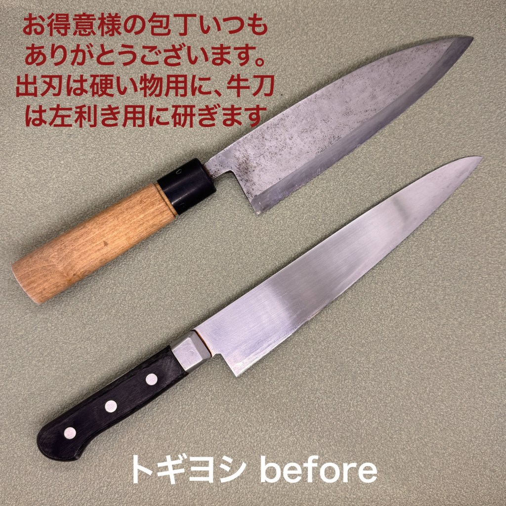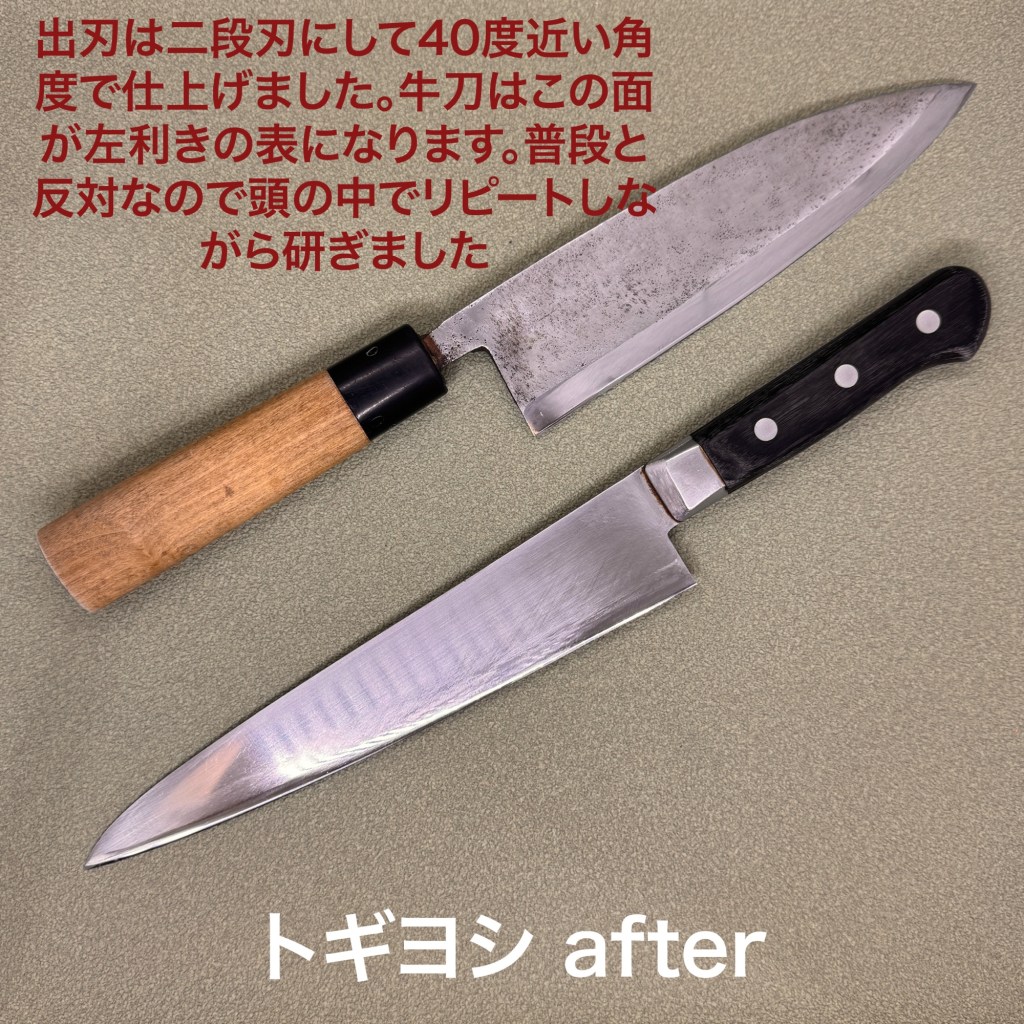 この2本を研ぎ上げました。お得意様の包丁、いつもありがとうございます。牛刀は左利きの奥様用、しっかり左に寄せて仕上げました。出刃は旦那様用で釣り餌を切るのに使っていて、その材料の皮が硬く、前の研ぎでは刃がボロボロに欠けてしまいました。通常の20度では耐えられない事が分かったので二段刃の角度を40度にしてみました。どれだけ耐えるのか!次回の研ぎまでのお楽しみ!