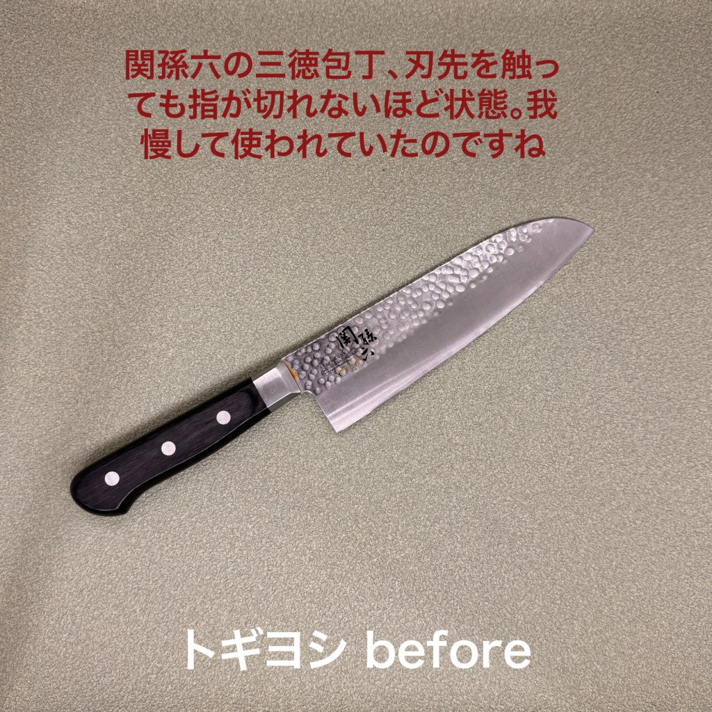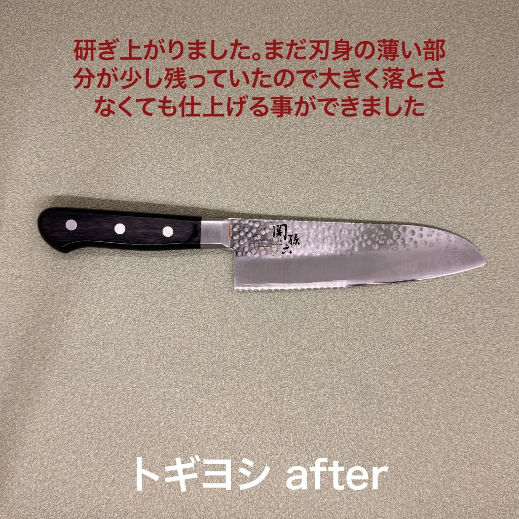 この1本を研ぎ上げました。関孫六の三徳包丁。全く切れなくてとのことで持ち込まれました。欠けなどは無く刃先がすっかり摩耗して丸くなっていて、これは料理するのも大変だった事が伺われます。研ぎの方は荒砥でしっかり刃先を出すのにひと苦労、その後は順調に仕上がりました。