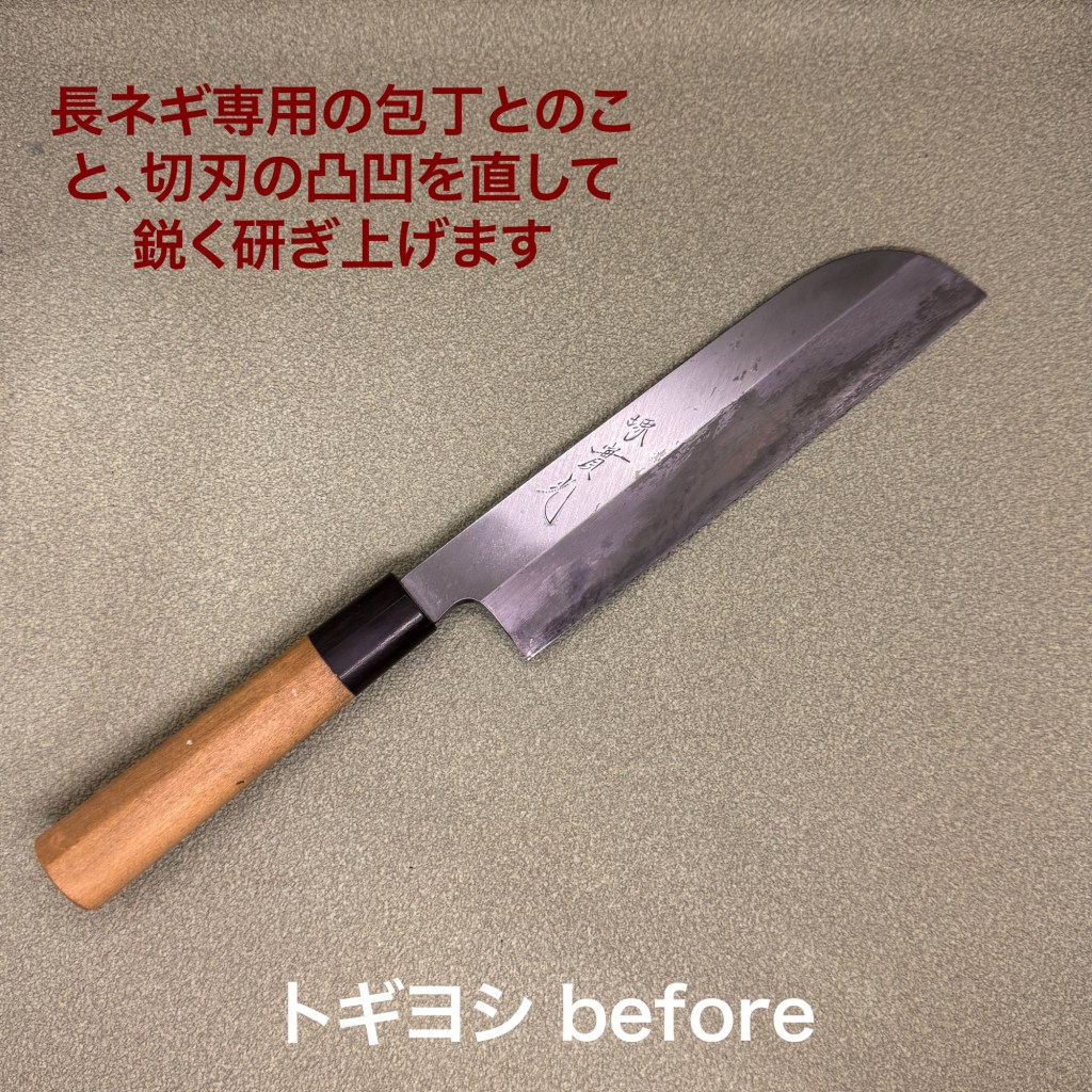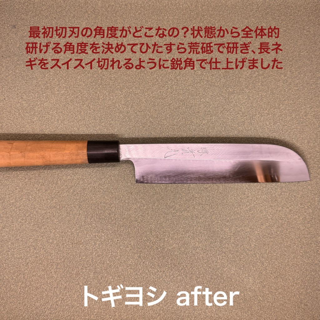 この1本を研ぎ上げました。實光の鎌形薄刃包丁。長ネギ専用と事ですが切刃が乱れていて二段刃もうまく研げていませんでした。荒砥で切刃を修正するにも角度が中々決まらず、全体を研げそうな角度を見つけてようやく修正しました。乱れた二段刃の影響で中々刃先まで砥石が当たらず、切刃の幅が広がりましたが、とても鋭利に仕上がりました。長ネギがスパスパ切れると思います。
