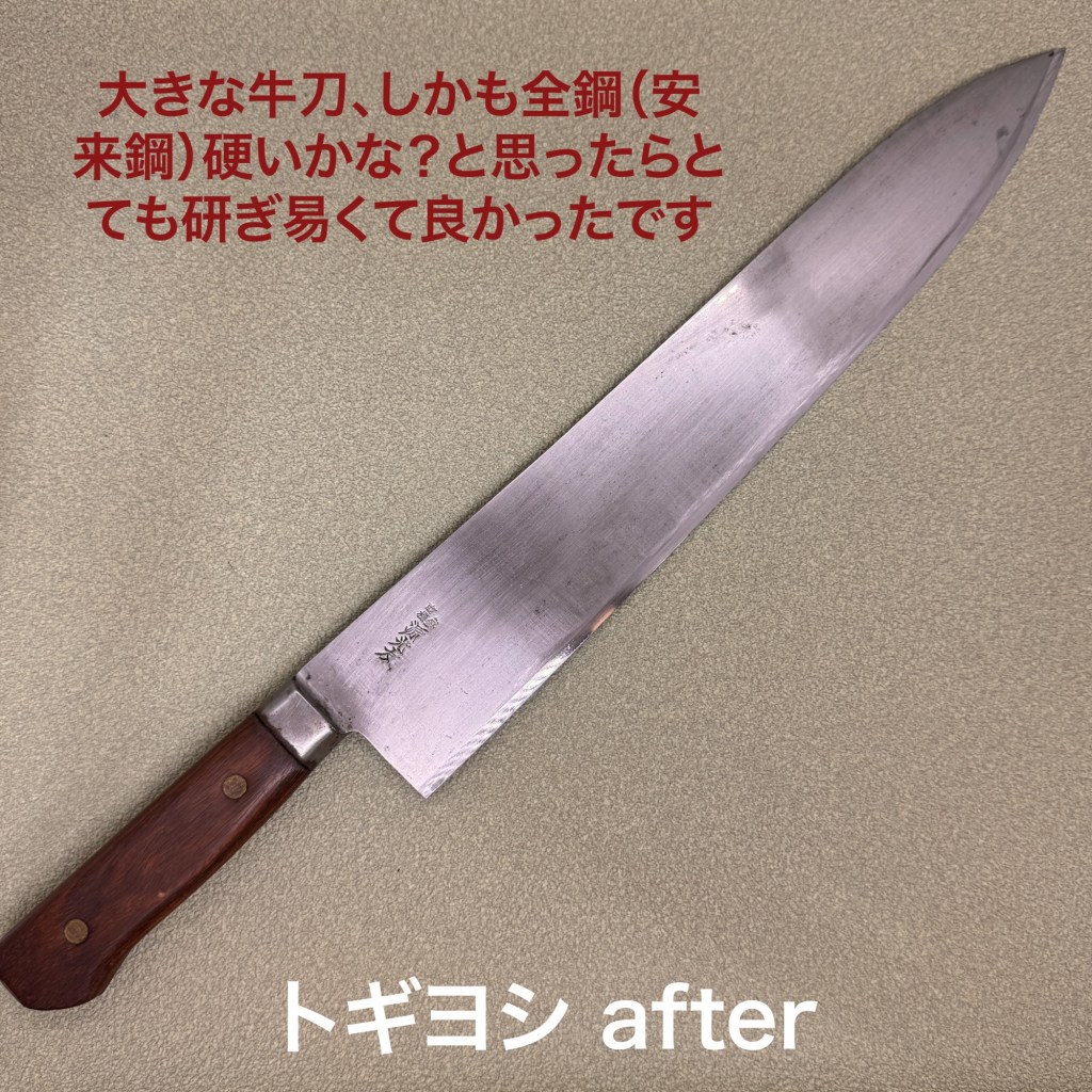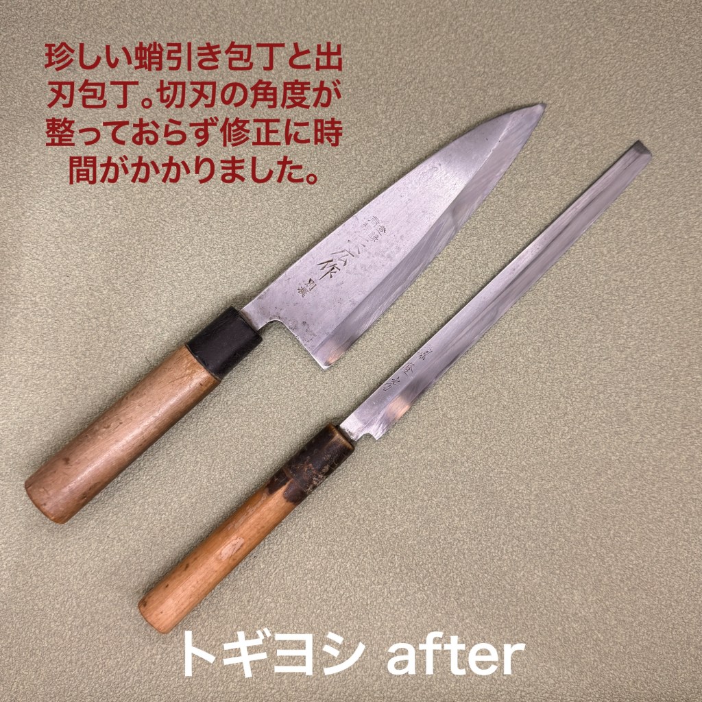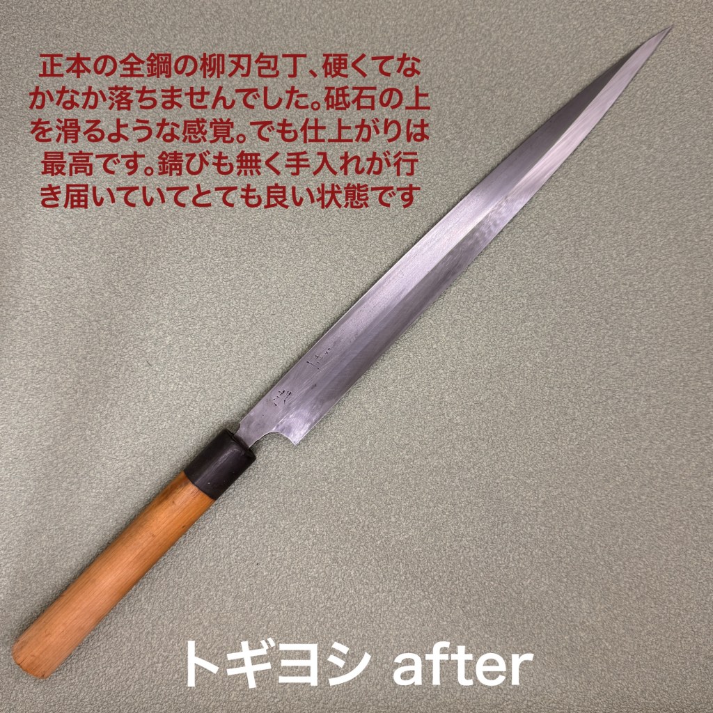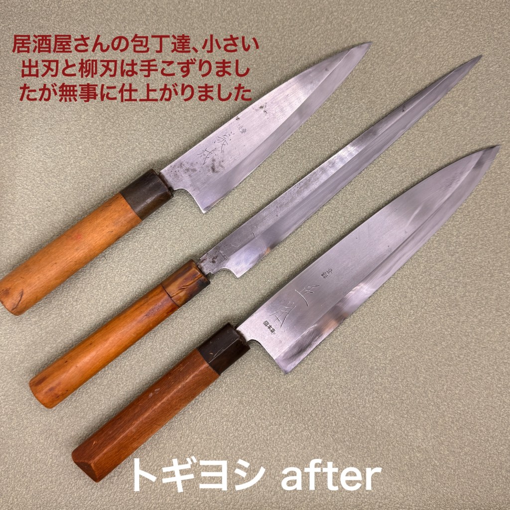 この7本を研ぎ上げました。正本の柳刃包丁は削れないと思ったら全鋼で荒砥でもなかなか落ちず切刃を作るのに苦労、でもその後は順調にとても良い仕上がりになりました。次は滅多に無い蛸引き包丁はかなり癖の強い研ぎ方になっていて、切刃も裏もかなり削り、その甲斐あって良い感じに仕上がりました。正広の出刃は裏に全く手が入っていないので功を奏し切刃を再生してカエリを落としたら良い感じに仕上がりました。正本の大きめの出刃は研ぎ進んで幅が狭くなっていますが錆びも無く良い状態で仕上がりました。正本の柳刃は錆が進んで桂が割れていましたがそのままにし、刃先に1箇所深い錆びあってなるべく影響が無いように仕上げました。義成の小ぶりな出刃は反りがあってなかなか難しい研ぎにな刃線を維持しながらどうにか仕上げました。最後に大きな牛刀はこれも全鋼(安来)で硬いかなと想像していましたが、とても研ぎ易くて日本の鋼は素晴らしい感じた1本でした。