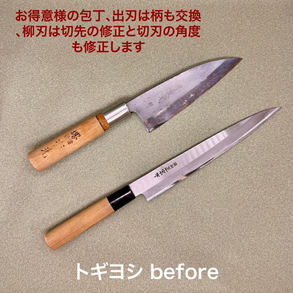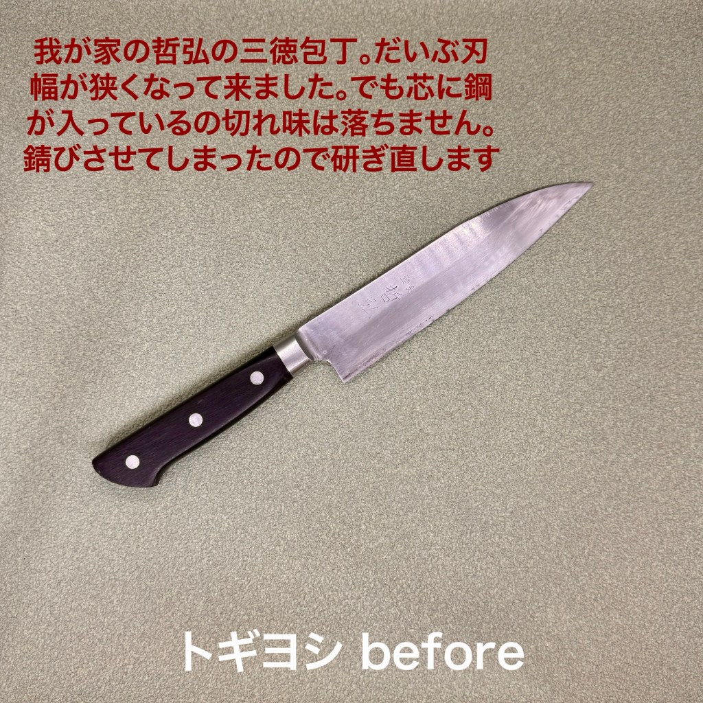 この4本を研ぎ上げました。堺重光の出刃と正宗作の柳刃はお得意様の包丁、いつもありがとうございます。柳刃は切刃の1/3だけ研いである仕様でしたが、それでは刃身が厚くなるので切刃全体を研ぐ事に、切先も曲がっていたので落として少し丸くしておきました。出刃は柄の金属口輪が柄が痩せて動くので柄ごと交換しました。哲弘の三徳包丁2本は幅の狭いのが我が家のモノで10年近く使っています。今回サビさせてしまったので研ぎ直しました。もう一本はお客様の包丁。まだまだ新品の幅を維持しています。黒ずみの下に錆びの穴が見受けられたので出来るだけ削って消すようにしました。やっぱり青鋼は切れ味が良いのと研ぎ易い鋼です。