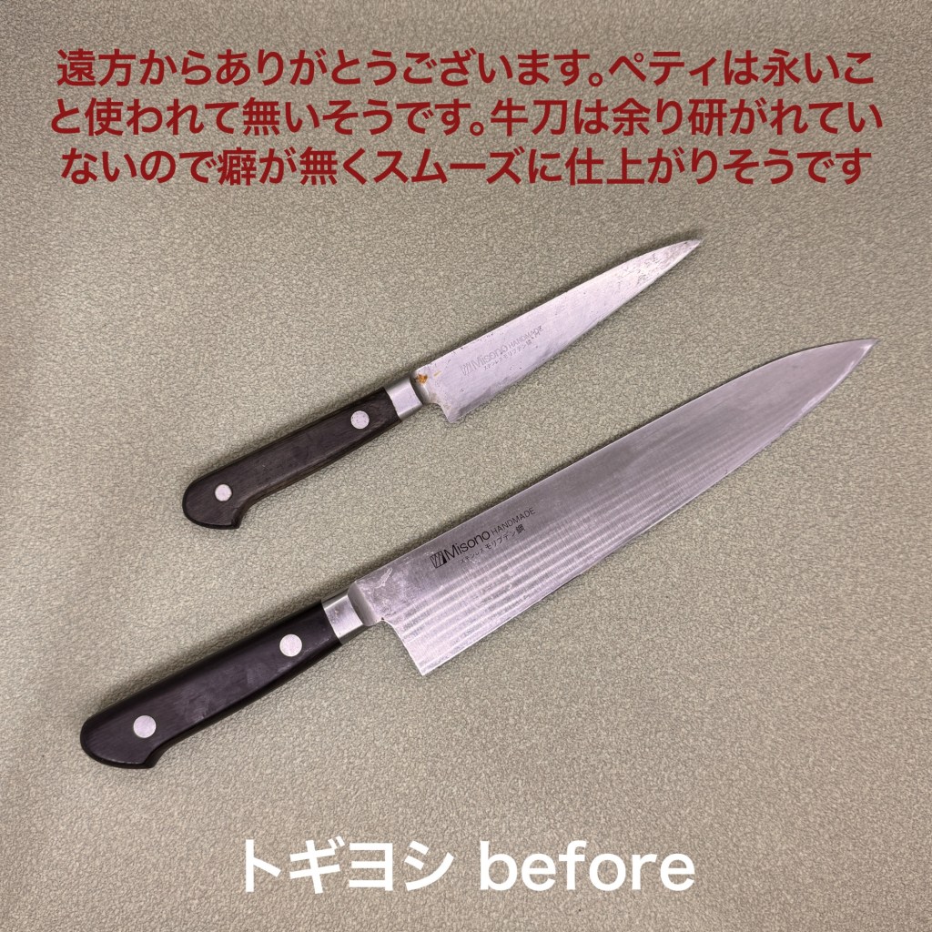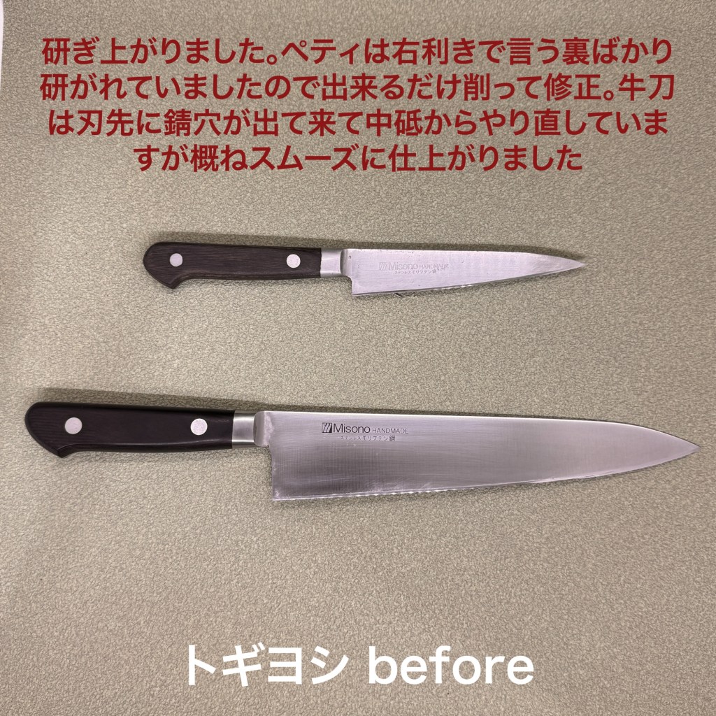 この2本を研ぎ上げました。ミソノのペティと牛刀。ペティは癖の強い研ぎ方になっており、まず刃先のラインを整え、裏に傷が多いのと、裏ばかり研がれておりまるで左利きのようでしたので、裏面は全体的に削って落とし、前面とバランスするように研ぎ上げました。牛刀の形はほぼ新品に近くスムーズに研ぎ上がるかと思ったら、仕上げで錆穴が出て来て、中砥に戻りましたが、小さな穴でしたので概ね順調に仕上がりました。