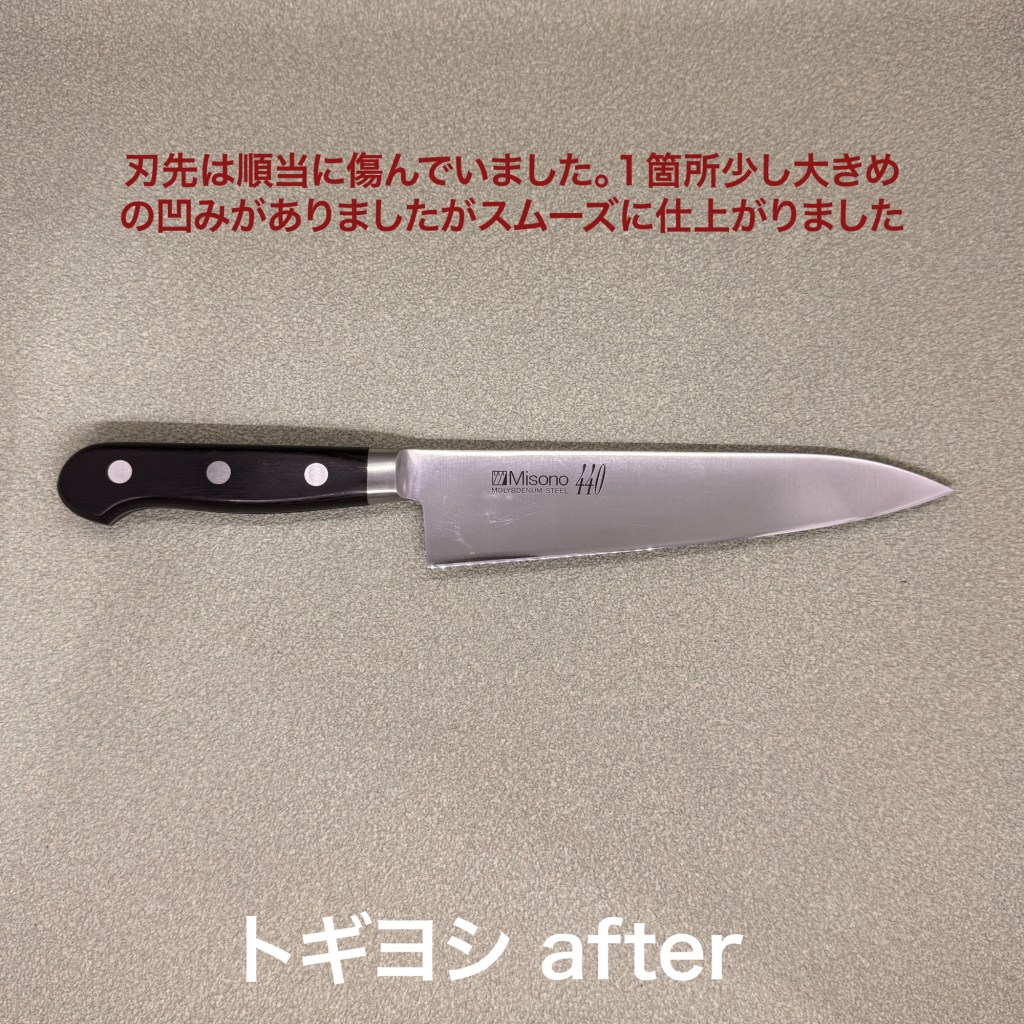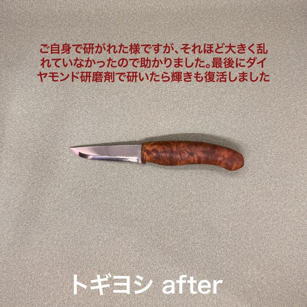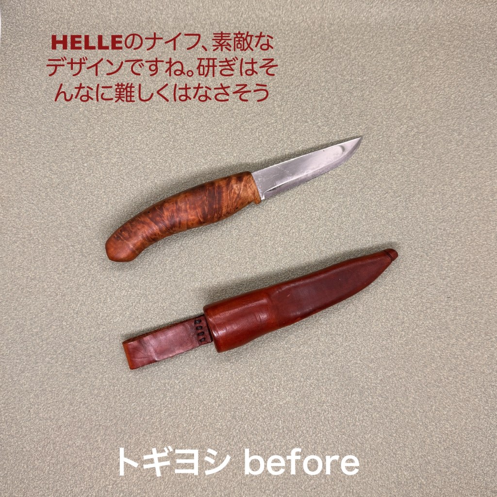 この2本を研ぎ上げました。ミソノの牛刀は以前購入頂いたモノ。初回研ぎサービスを実施します。刃先は順当に傷んでいて、1箇所少し大きめと言っても1ミリ以下の凹みがあったくらいで順調に仕上がりました。HELLEはノルウェーのナイフメーカー。有名なんですね。ナイフには疎くて。普通のステンレス鋼なのと、ご自身で研いだ痕跡もそれほど乱れていないので順調に仕上がっています。最後にダイヤモンド研磨剤で研いたら輝きも戻りました。