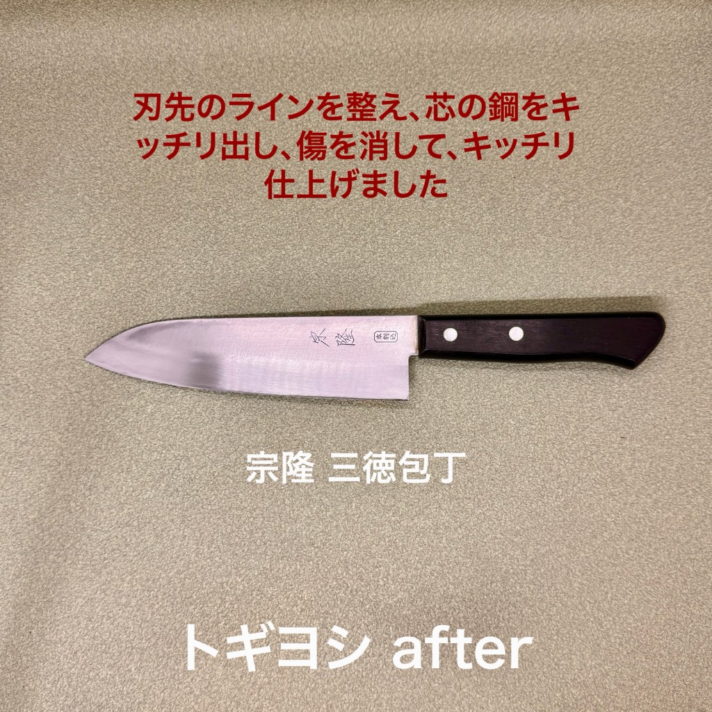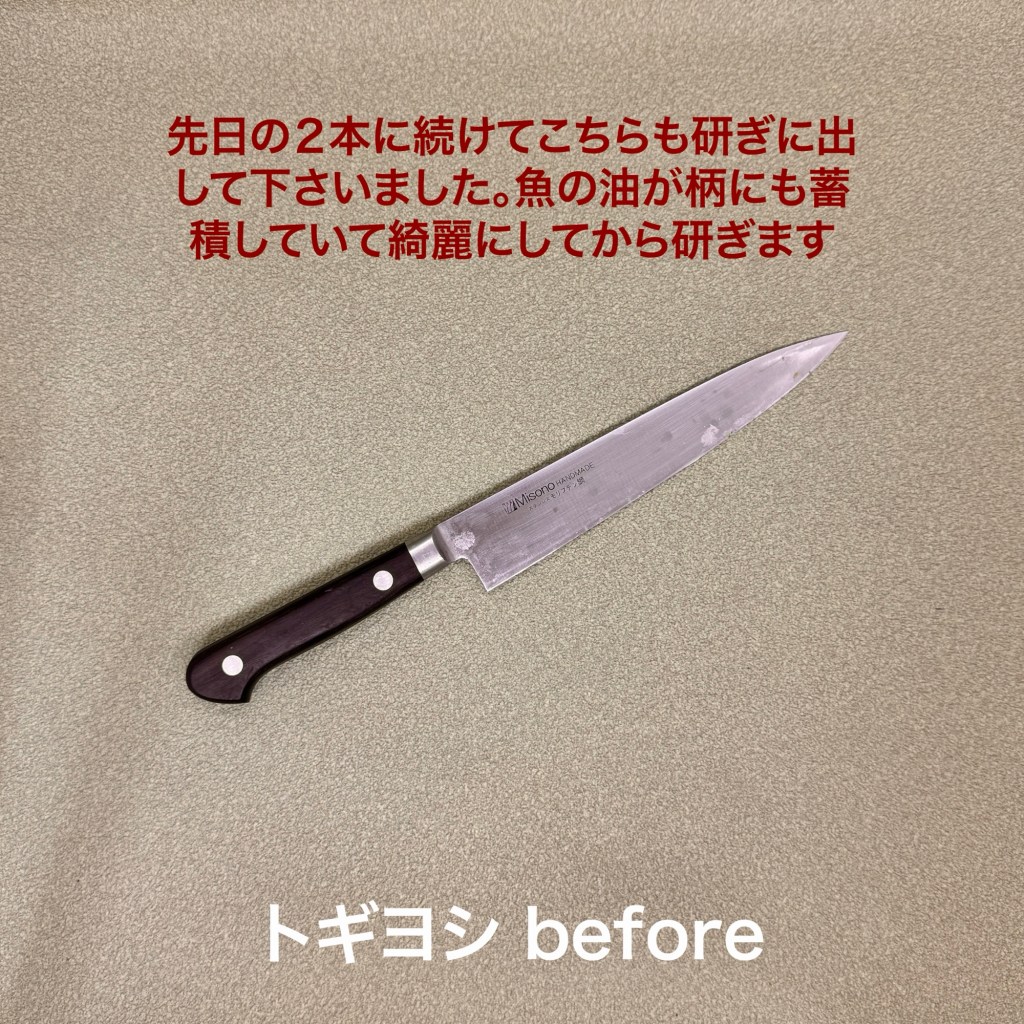 この2本を研ぎ上げました。宗隆の三徳包丁は高校の修学旅行土産の定番包丁。これまでにたくさん研いでいます。裏には感謝の言葉が刻まれています。これまではお爺様が研がれていたのですが高齢で研げなくなり持ち込まれました。刃先のラインが尻上がりになっていてコレを直し、傷を消し、綺麗に仕上がりました。ミソノのペティは魚の油、うろこが残っていたので、まずは掃除。柄には結構油が残っていましたね。刃先の方は新品から手付かずでしたのでスムーズに仕上がりました。