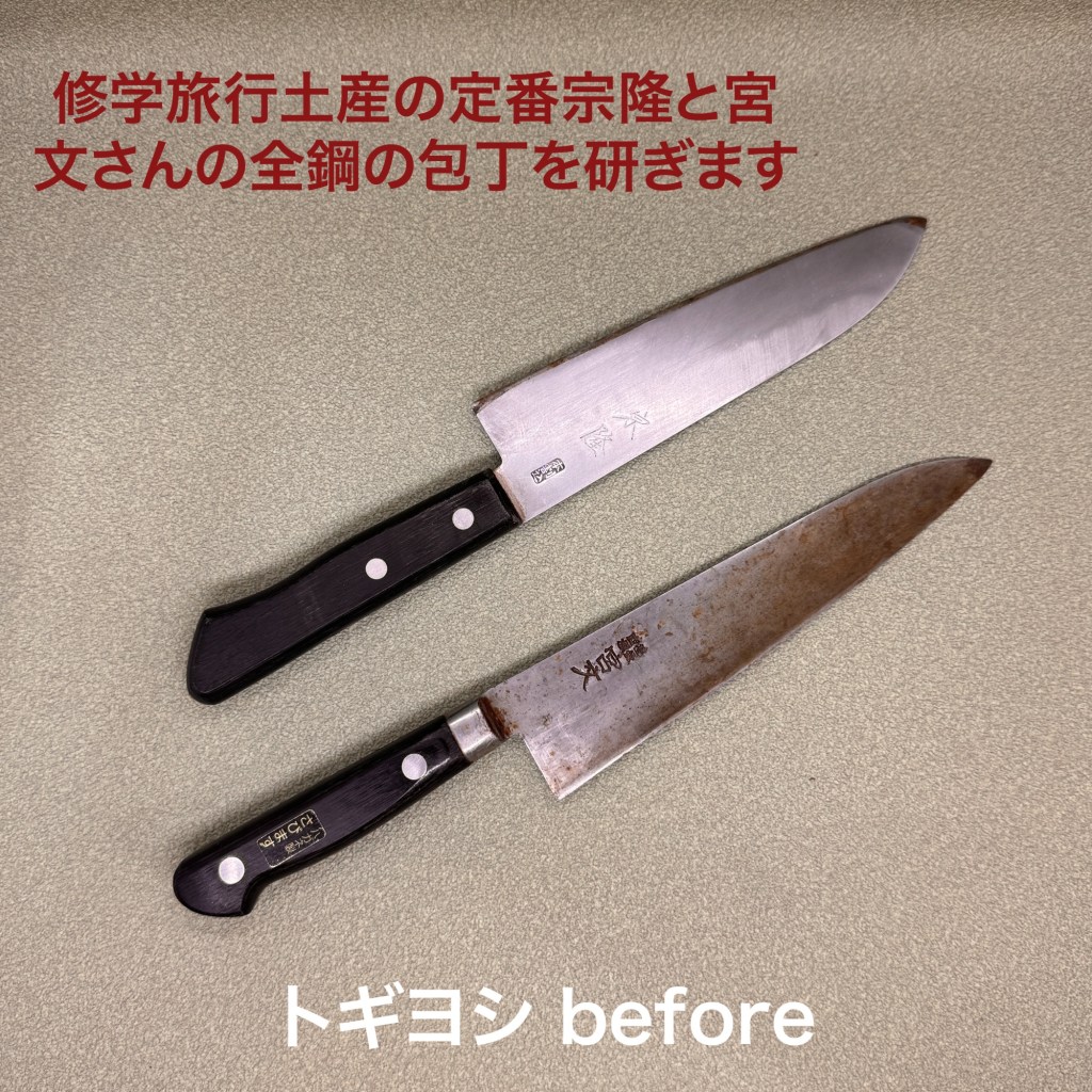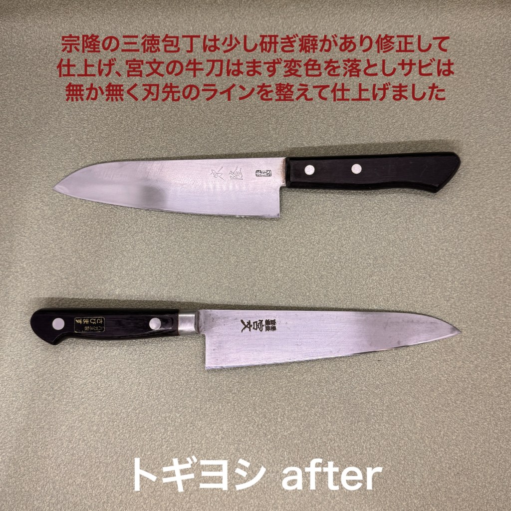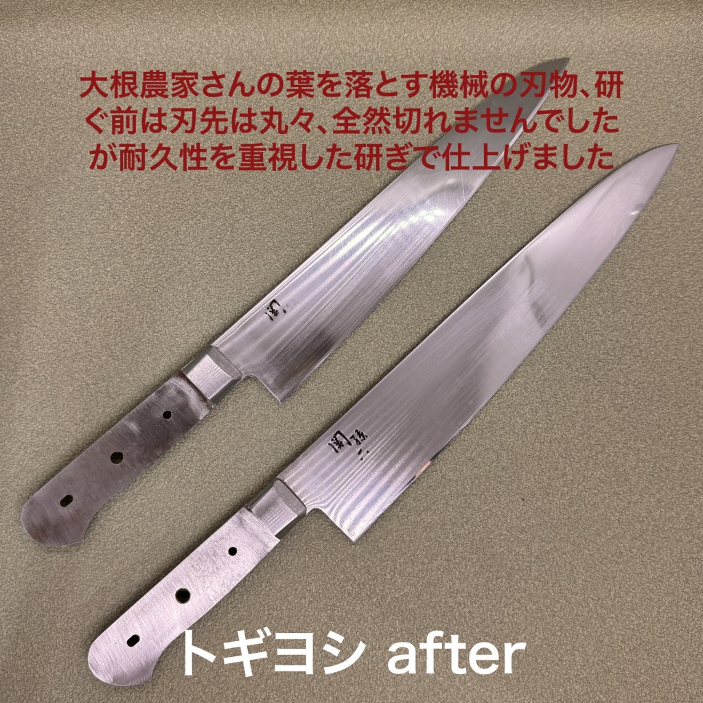 この4本を研ぎ上げました。宗隆の三徳包丁は修学旅行土産の定番。ちょっと癖のある研ぎ方でしたので修正して仕上げました。宮文さん全鋼の牛刀は鋼特有の変色があり錆が心配でしたが磨くとサビはほぼ無く刃先が多少錆びていたので刃先のラインを整えると同時に落としてから仕上げました。関孫六の大きな牛刀は大根農家さんの葉を落とす機械の刃物。なので柄がありません。刃先はというと丸々で全く切ない状況、耐久性重視の研ぎ方で仕上げました。