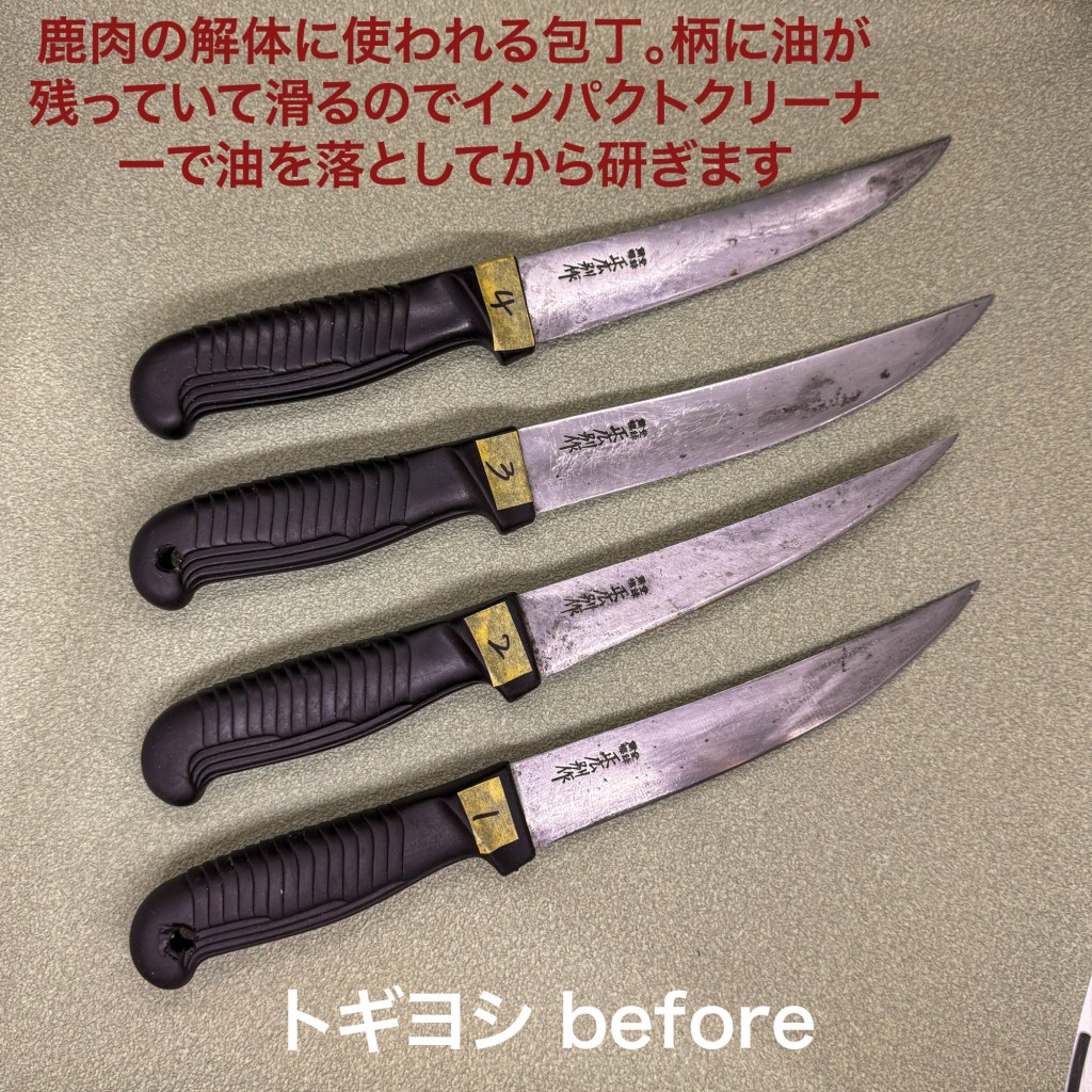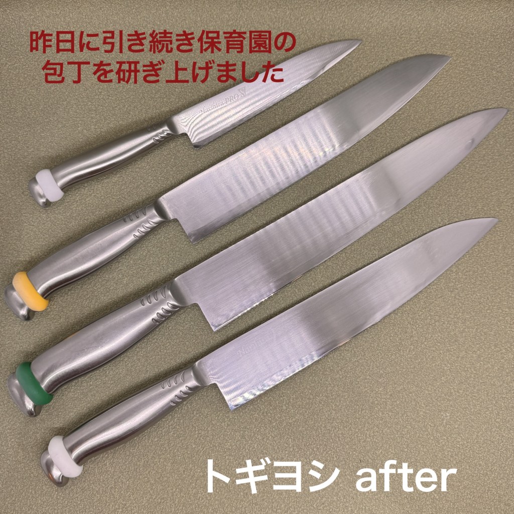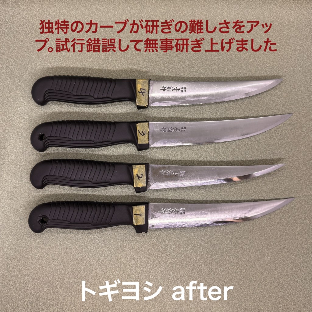 この8本を研ぎ上げました。ナリヒラの牛刀とペティは昨日に引き続き保育園の給食で使われる包丁。ありがとうございます。ペティだけ刃身が厚かったので落としてから仕上げました。園に伺った時に園児たちを見たら20年前の娘の姿が浮かびました。続いて独特の形の包丁は鹿肉を捌くとに使う包丁。ご自身でだいぶ研がれていて崩れていたので新たに15度で刃を付け直しました。カーブ部分はなかなか刃先まで砥石に当たらないので、何度も研いでは確認を繰り返しました。今日のBGMはインコグニート。かっこいいR&B、作業も捗りました。