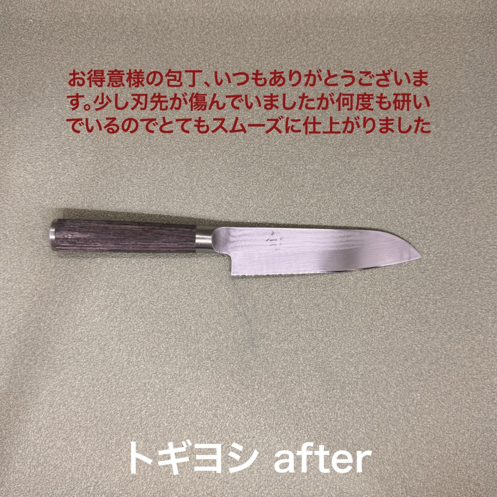 この1本を研ぎ上げました。小ぶりな三徳包丁はお得意様の包丁。もう何回研いだかな、いつもありがとうございます。刃先の状態は少し傷んでいましたが、何度も研いでいるので私の形になっておりスムーズに研ぎ上がりました。写真はありませんが、鹿肉を捌くナイフを10本研ぎました。先日研いだモノは最初の切れ味は良かったが5日位で切れなくなったと聞きました。出刃包丁のように切刃を作ったのですが、鹿肉には合わなかったので、今回は刃の角度を25度にして元々の形に仕上げました。上手くいくといいな。あと牛肉を切ると切れ味が落ちると聞いたので研究します。研ぎは奥が深い。