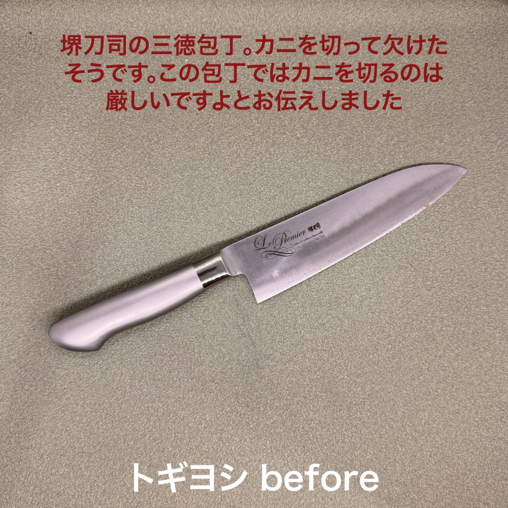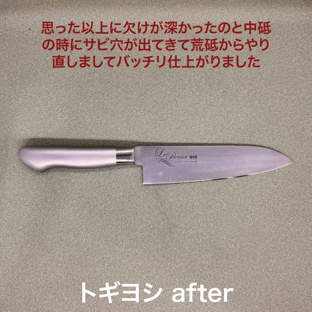この2本を研ぎ上げました。堺刀司の三徳包丁はオールステンレスの衛生的な包丁。カニを切ったそうで刃先がボロボロ。カニは出刃包丁で切りましょう!研ぎの方は荒砥で落として中砥まで行ったらサビ穴が出てきて荒砥からやり直し。ステンレスはコレがよくあります。堺刀司の出刃包丁はオレンジ色のサビが浮いていましたが、深く無いと思った通り簡単にピカピカになり安心しました。刃先の方にもサビは無く、裏も全く手が入っていなかったので裏スキも残ってバッチリ仕上がりました。