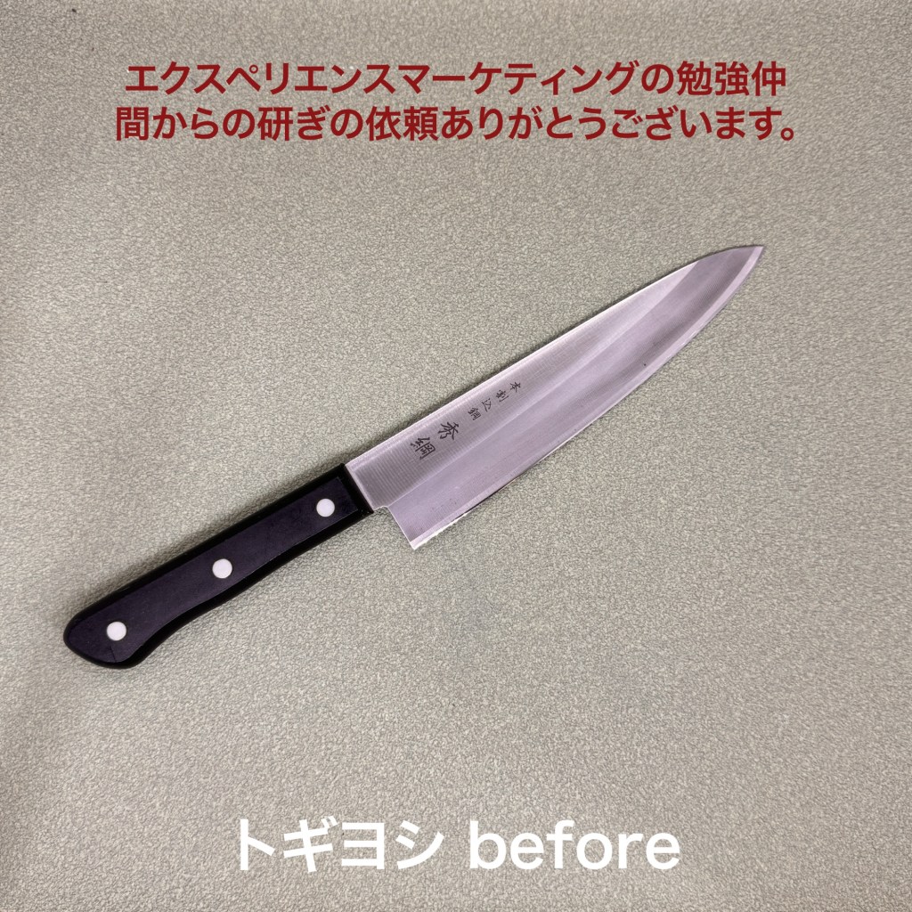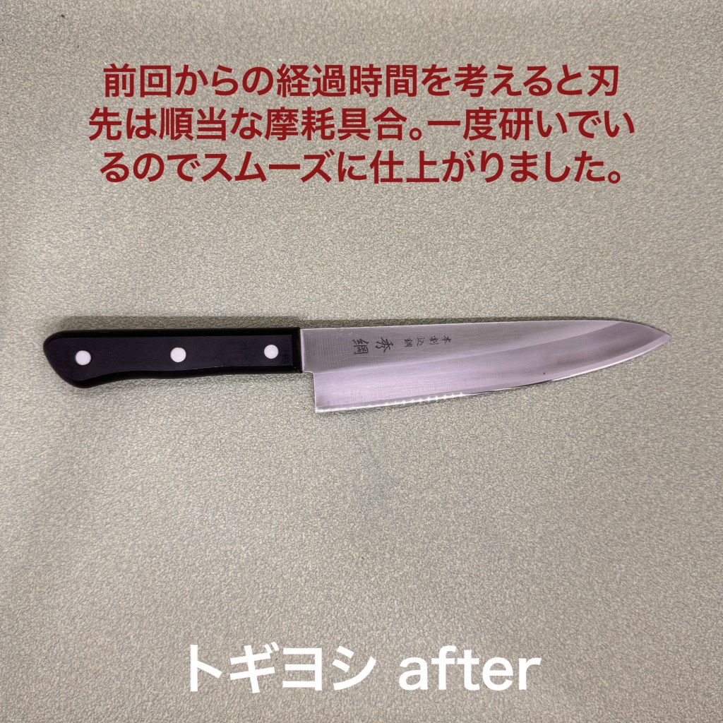 この1本を研ぎ上げました。秀綱の牛刀はエクスペリエンスマーケティングの仲間のA子ママことsns集客ディレクター下澤 @mika_shimosawa さんの包丁。いつもありがとうございます。前回からの経過期間を考えると順当な摩耗具合。大きく欠けたり、錆穴も無く、油汚れも無いので丁寧に使われているのが判ります。研ぎの方は刃先の荒れを荒砥サッと落としスムーズに仕上がりました。