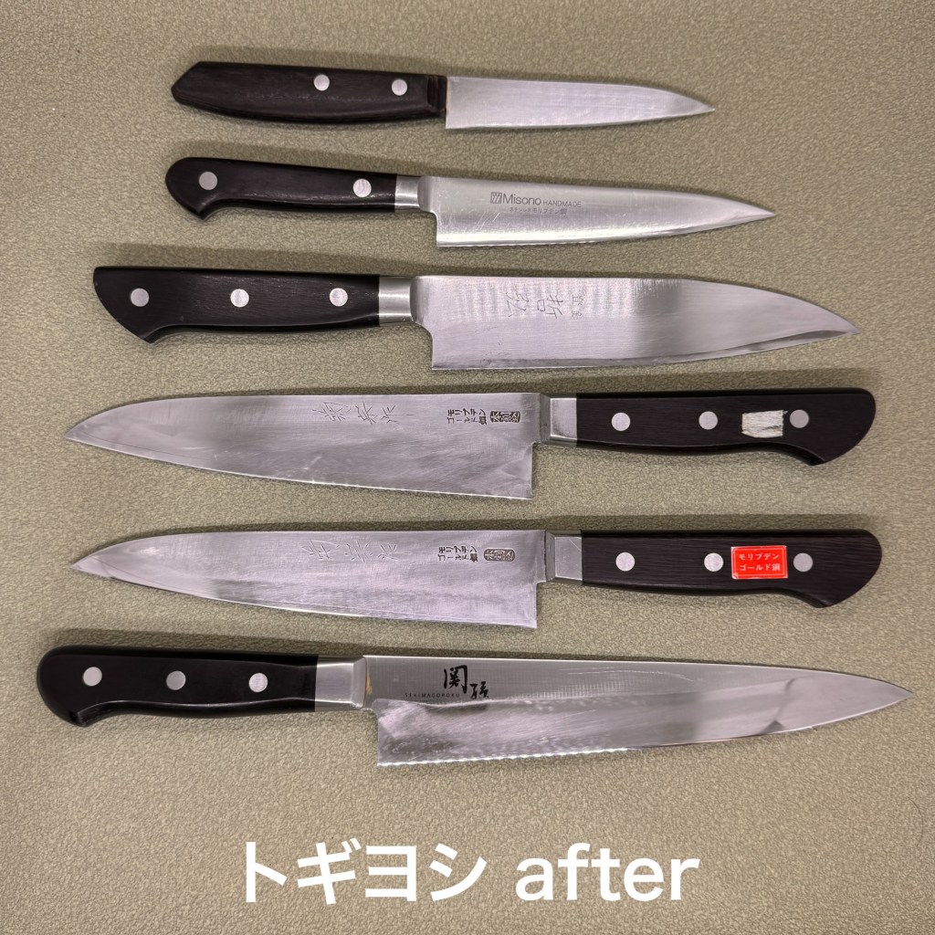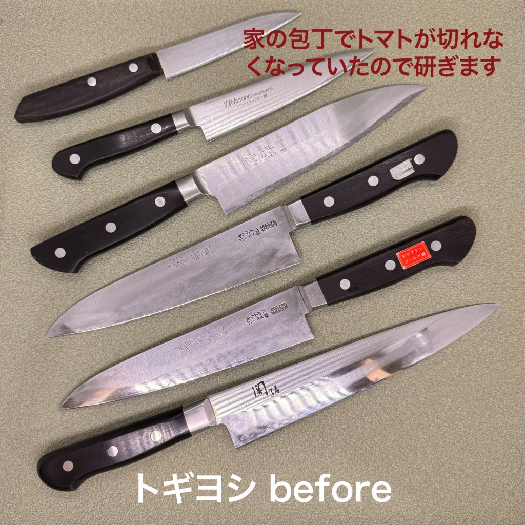 先日我が家の包丁6本を研ぎ上げました。月初め研ぐようにしていた我が家の包丁。チョット忘れてたら、トマトが切れない状況になっていました。これでは料理が捗らないので、一気に全部研ぎました。ここまで摩耗しない状態ですと仕上げ砥石だけでも良い場合もありますが、中砥から研ぎ上げました。牛刀だけでも3本、改造三徳包丁1本、そんなに必要なの?と思われますが、メインは三徳包丁で、牛刀は長ネギ用、長い牛刀はパウンドケーキカット用と分かれています。これこそ適材適所。