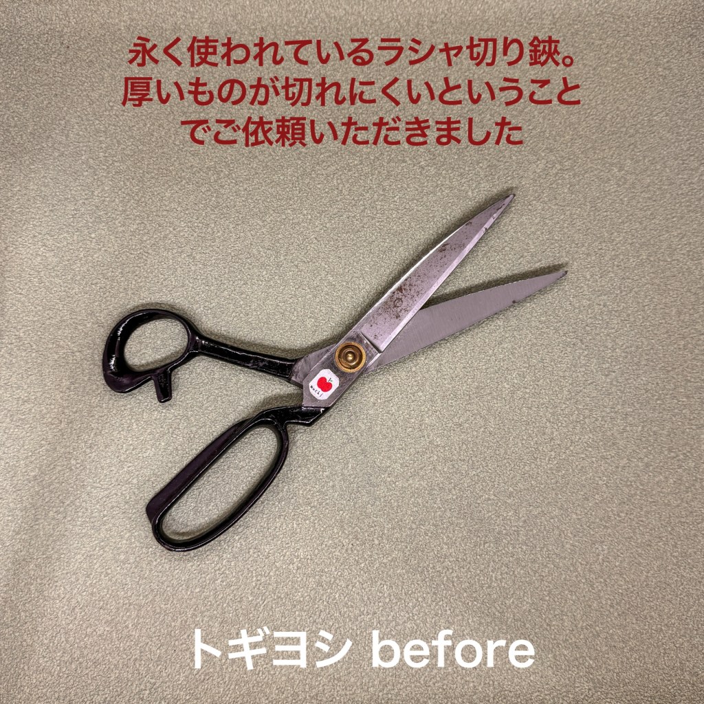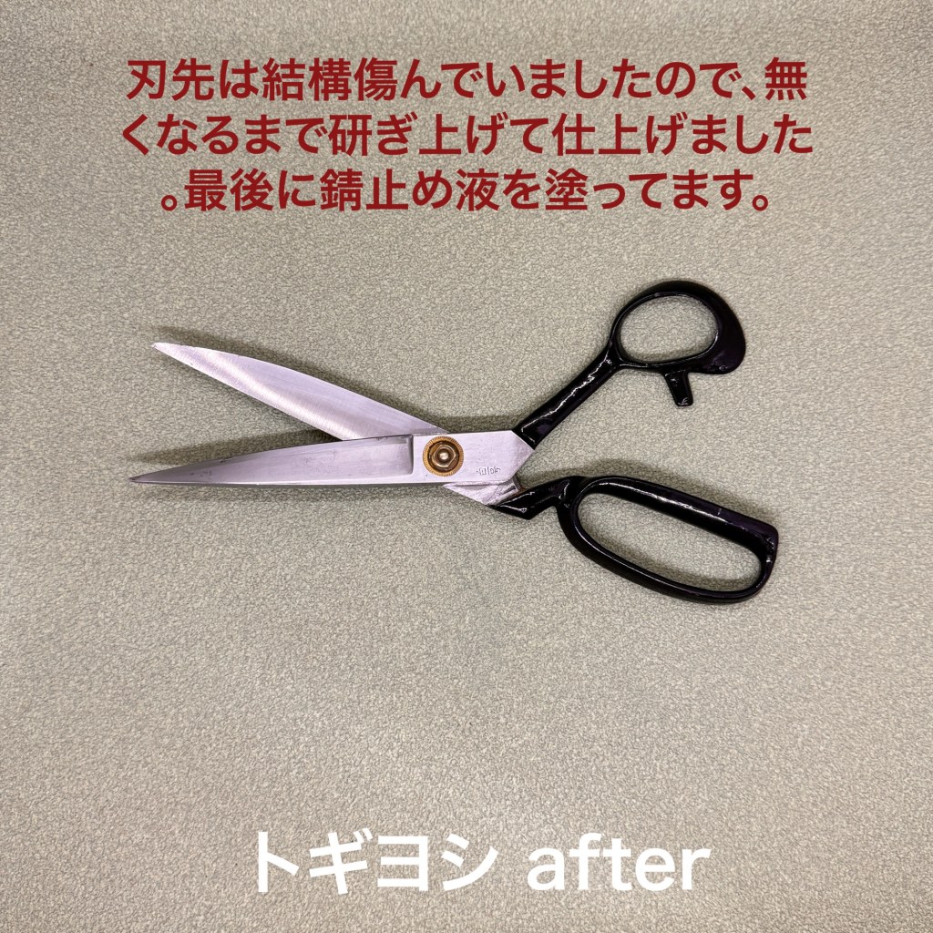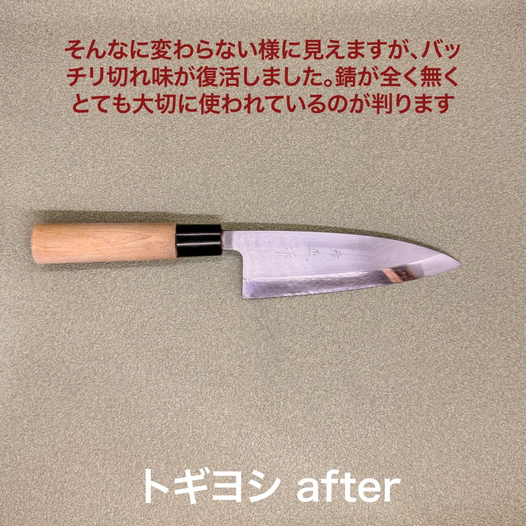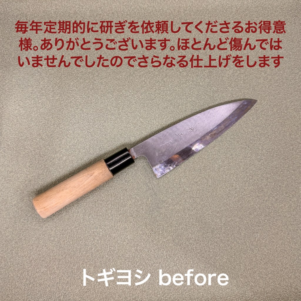 この2本を研ぎ上げました。出刃庖丁は毎年研ぎを依頼してくださるお得意様の包丁。今年もありがとうございます。コピー用紙を試し切りしたところ充分な切れ味。今年も魚のシーズン前にメンテという事ですね。荒砥を使うほど傷んでいないので中砥でもう一度刃を付け直し、切り刃を研いで磨いて仕上げました。とても良い切れ味になっているので魚を捌いてもらうのが楽しみです。ラシャ切り鋏は永く使われて厚い布が切れにくいとの事で研ぎを依頼されました。見たところ刃先に摩耗したキラキラ(ガタガタ)が沢山見えます。そこが無くなるまで研いで完了。試し切りのTシャツがスパスパ切れました。