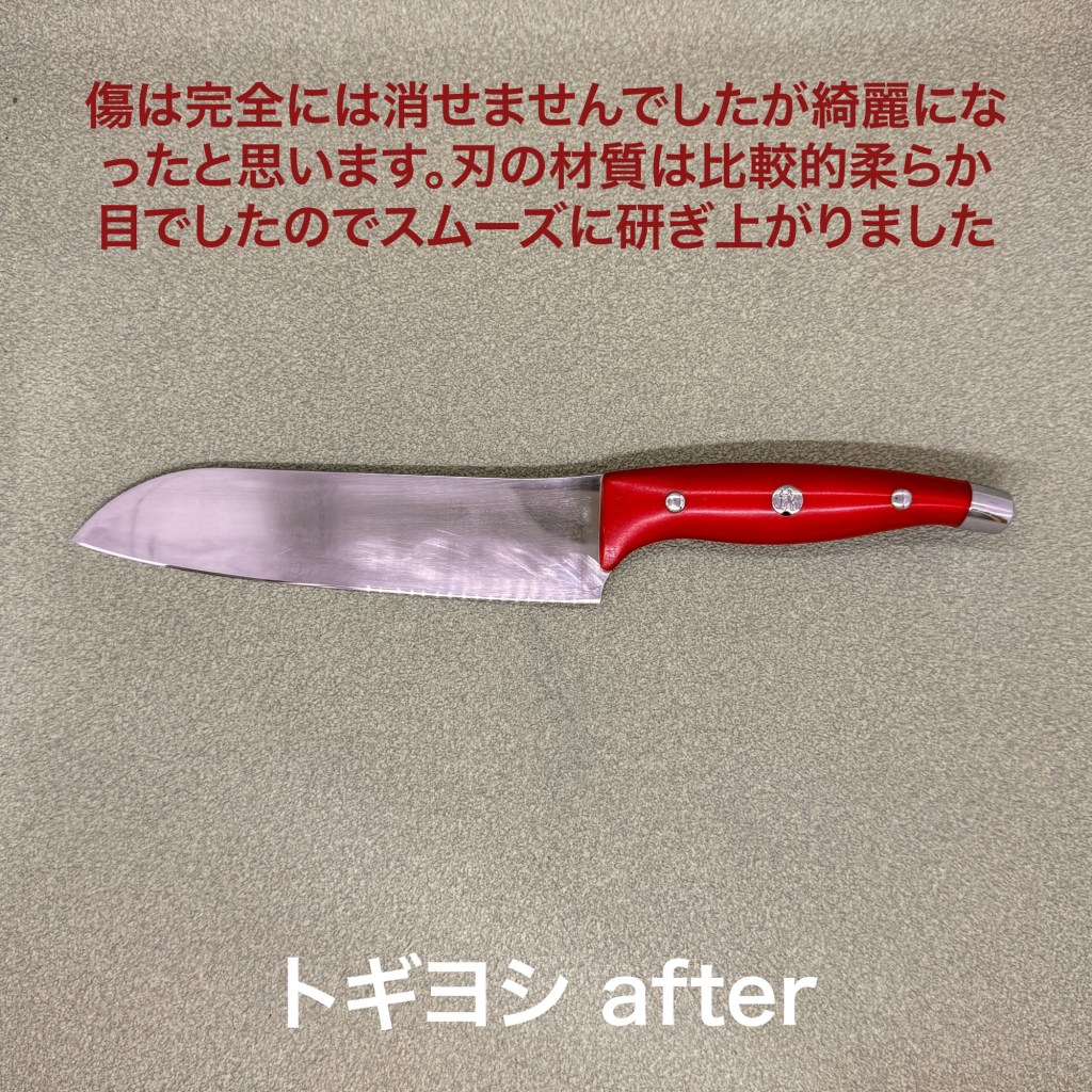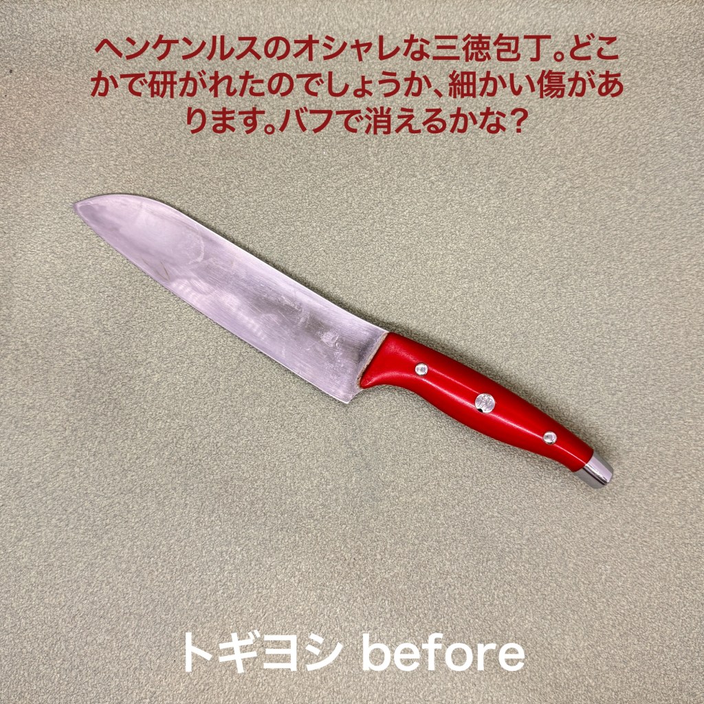 この1本を研ぎ上げました。ヘンケンルスの赤い柄が素敵な三徳包丁。何処かで研がれたかご自身で研がれたか判りませんが、うっすら傷が広がっていて、深くは無いのでバフ研磨で消える良いかなと、ダイヤモンドコンパウンドで磨いたら4割くらいは消えたと思います。刃先の方はそれほど傷んではいませんが刃先のラインがカーブしており少しフラットに戻してから仕上げました。材質は比較的柔らか目で研ぎ易かった包丁です。