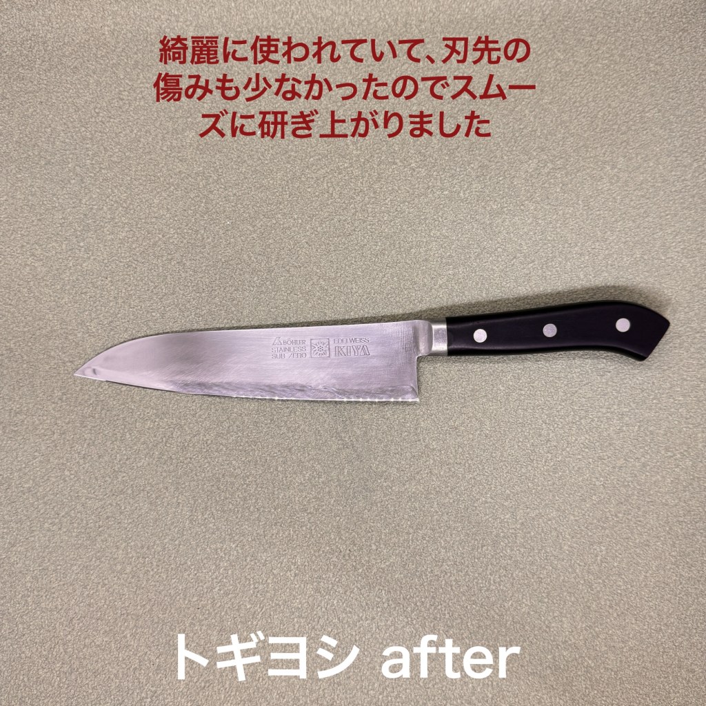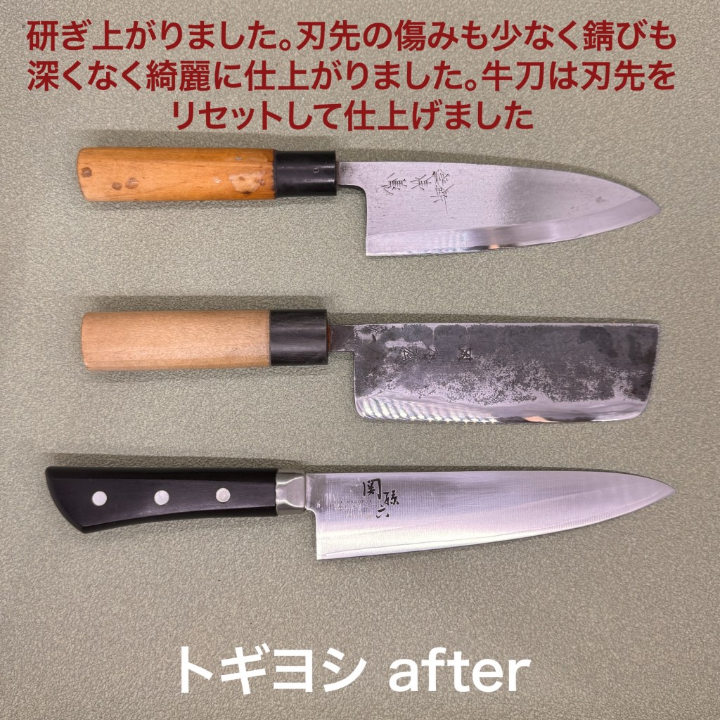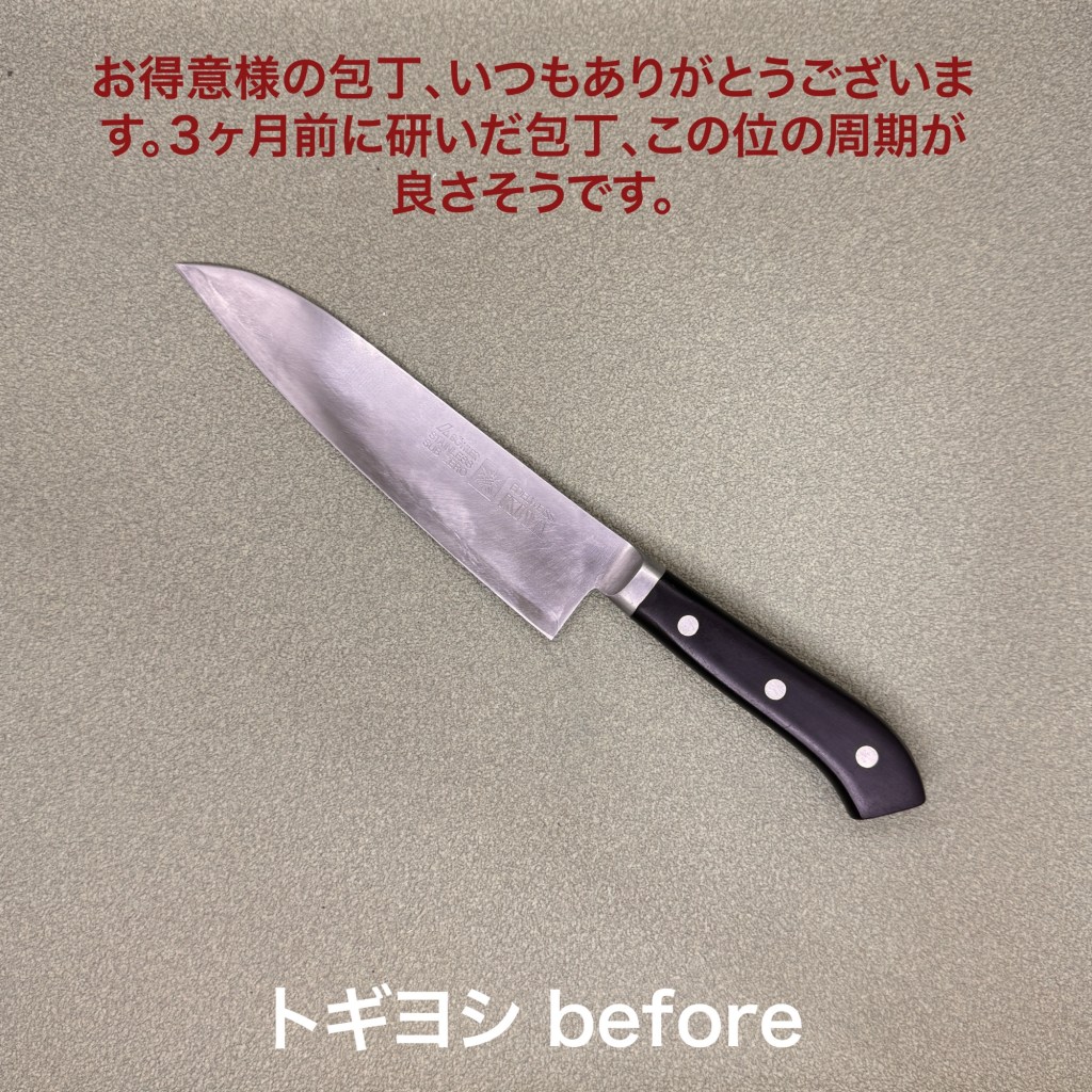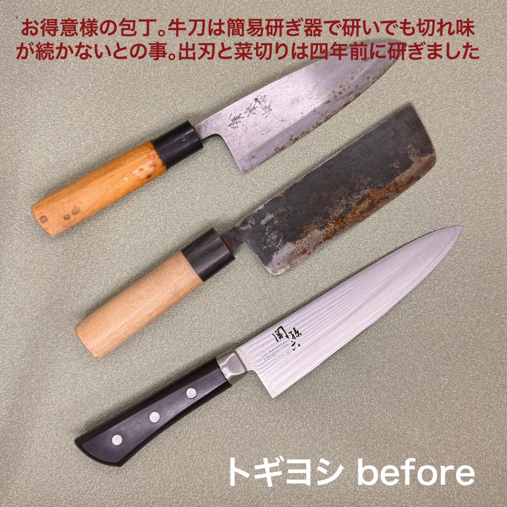 この4本を研ぎ上げました。どちらもお得意様の包丁。いつもありがとうございます。木屋の牛刀は3ヶ月前に研いだ包丁。時々聞かれますが、どのくらいの間隔で研いだら良いですか?この3ヶ月と言うのが指標になると思います。ただ硬いまな板ですとそこまで持たない事があります。3本の包丁のうち2本の和包丁は台帳を見ると四年前に研いだ包丁。刃先はかなり摩耗していました。錆びもありますが深くなく順調に仕上がりました。関孫六の牛刀は簡易研ぎ器で研いでも切れ味が続かないとの事でご依頼頂きました。目を凝らして刃先を見ると白い筋がいっぱいあり、刃先に深い傷がある状態。これでは刃先がノコギリなので、まな板に当たると刃先にが潰れてすぐキレ中なります。刃先を全部落として研ぎ上げました。