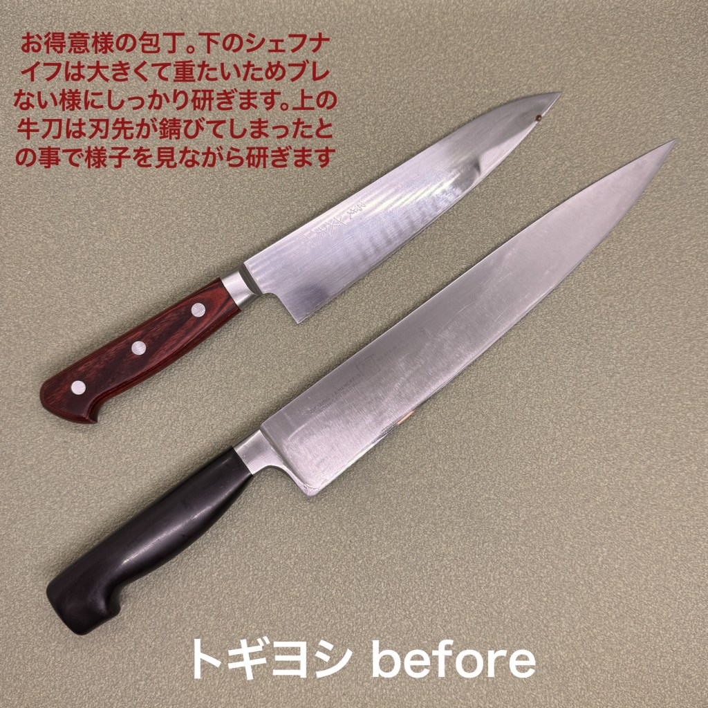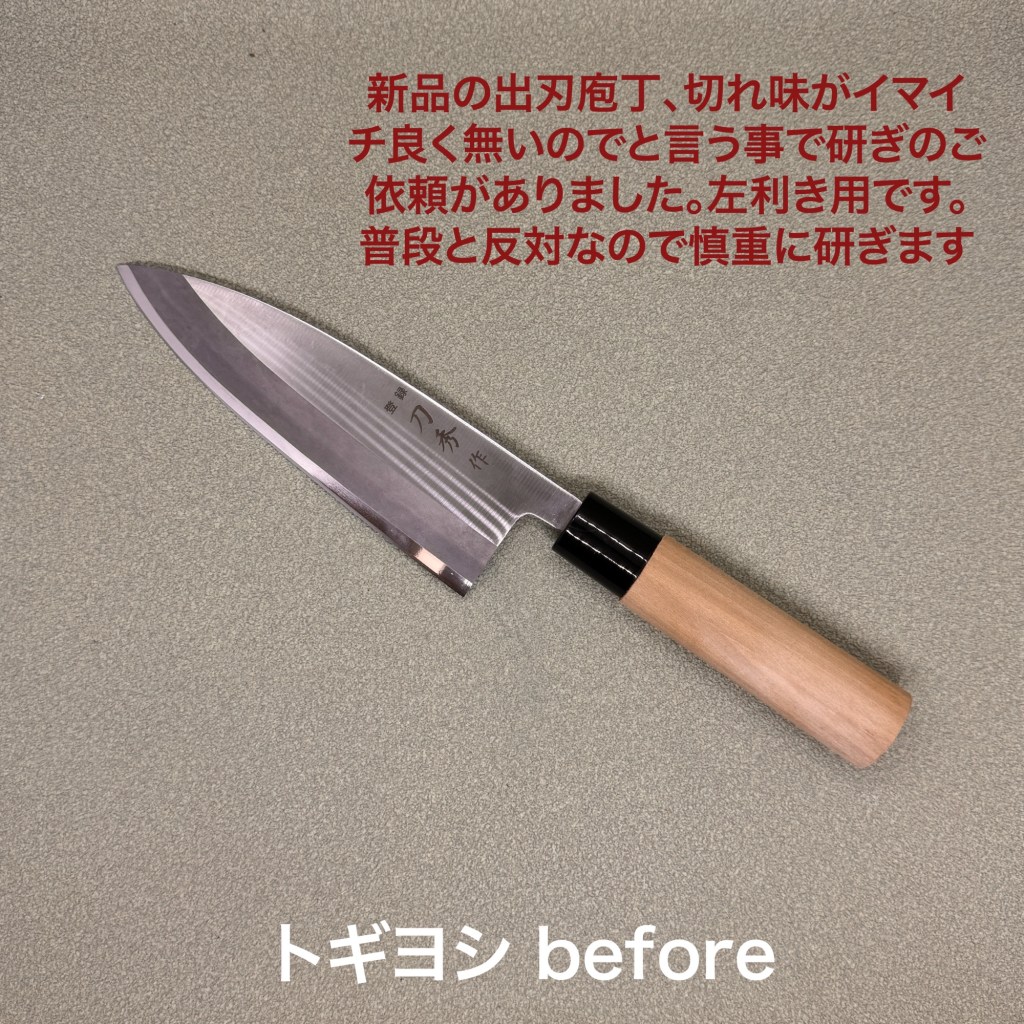 お得意様の包丁二本。宮文の牛刀は先端に近いところを錆びさせしまったということで、研ぐと錆穴複数出てきて何度か荒砥で刃先を落としてようやく仕上がりました。大きなシェフナイフは重たいので、ブレないようにしっかり支えて研ぎ上げました。新品の左利き出刃包丁はどうも切れ味が悪いとのことで研ぎを依頼されました。多くの和包丁は7、8割の仕上がり状態です。職人が自分に合わせて研ぐ余白を残しているとも考えられます。この出刃は小刃が大きいという表現でいいのかな?角度がかなり鈍角でしかも大きい(幅が広い)ので刃身が厚くそのままではどうやっても切れ味が良くならないので、切刃を薄めてちょうど良い感じで仕上げました。