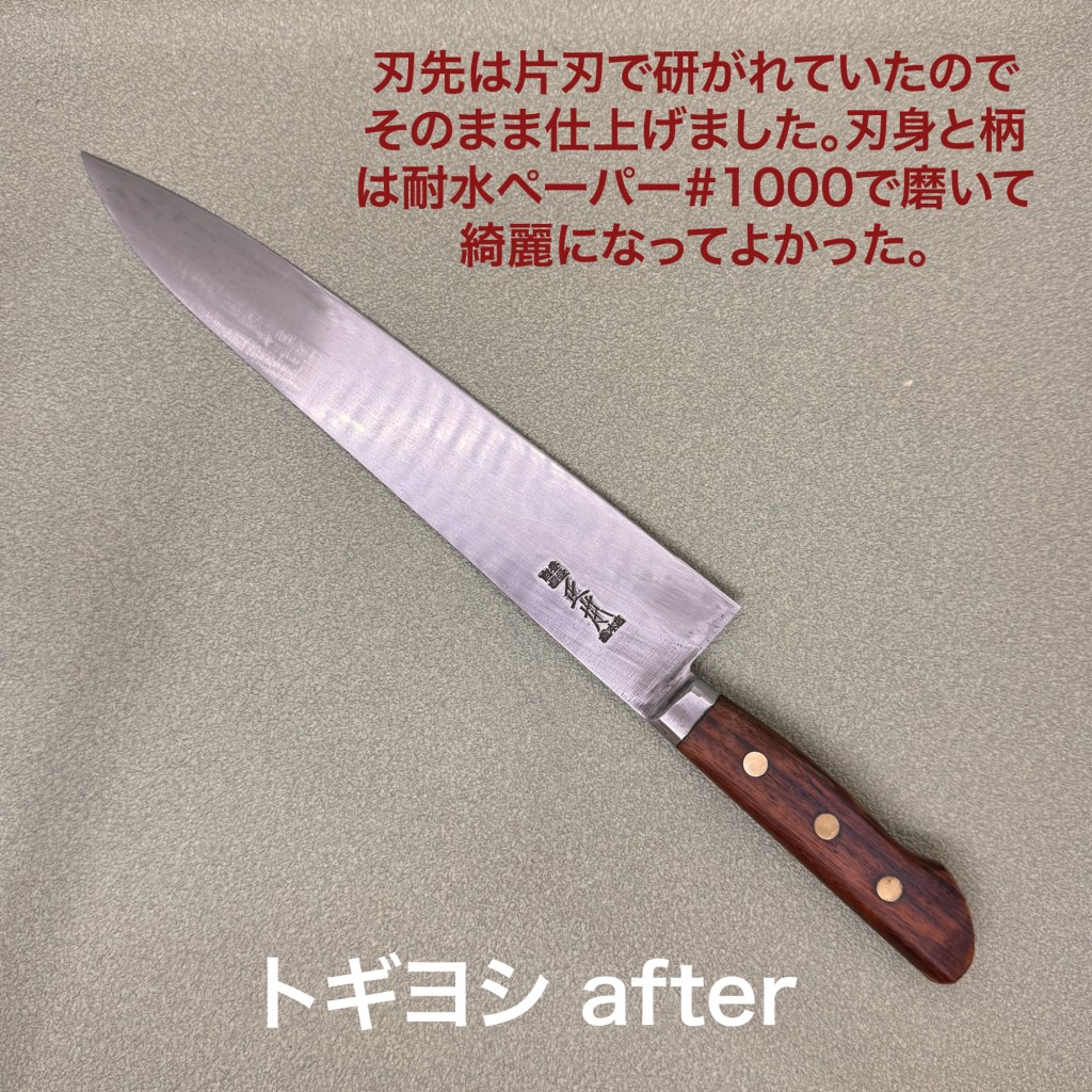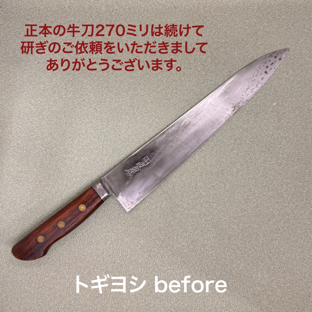 お盆休みは自宅の包丁を研ぎましたが久しぶり研いだ気がします笑。続けて研ぎのご依頼いただ片刃ましてありがとうございます。どれも大柄の包丁を使いこなされていますね。正本の牛刀270ミリは片刃に研がれていたのでそのままで研いでいます。刃先の傷みは少なくスムーズに仕上がりました。刃全体に傷が目立ったので、320番のゴム砥石でサッと削り、耐水ペーパーの1000番で磨きました。ご家庭でも厨房でも1000番の耐水ペーパーを用意しておくと良いと思います。錆びてもサッと落とせますので。磨く時は平らなところに置いて刃先に触れない様に磨いてね。