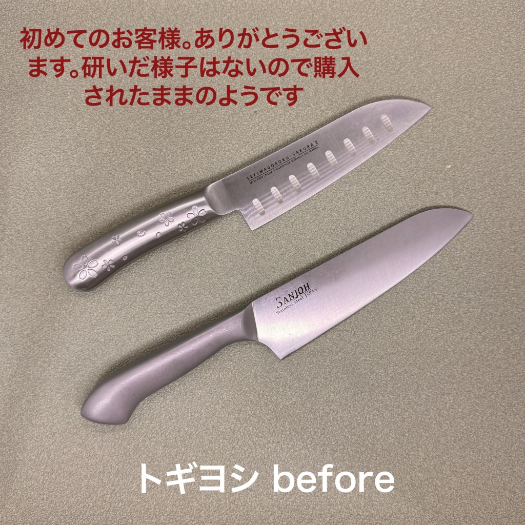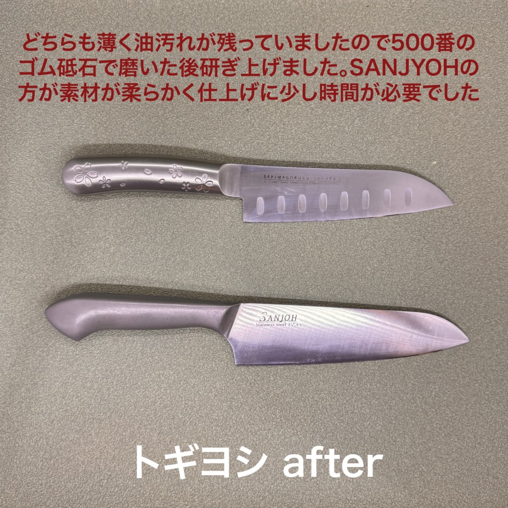 SEKIMAGOROKU関孫六の小ぶりな三徳包丁と三條ブランドの三徳包丁。どちらも薄く油汚れが残っていましたので、そのままでは手が滑って怪我しては困るのでクリーナーと500番のゴム砥石で磨いてから研ぎ始めました。関孫六の方は特に問題はなくスムーズに研ぎ上がりました。三條ブランドの三徳包丁は材質が柔らかめで仕上げに少し時間が必要でした。それはステンレスがもともと粘り強い材質なのでカエリがなかなか離れてくれない為です。