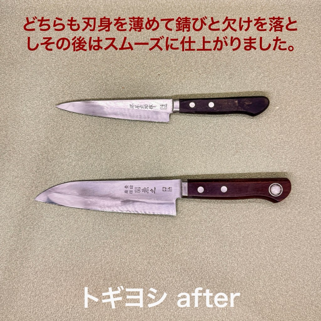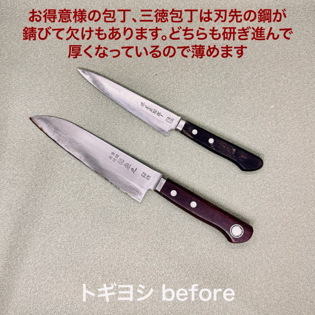 お得意様の包丁、いつもありがとうございます。関兼之の三徳包丁は刃先の鋼部が錆びています。深くないと良いのですが、あと欠けもあるのと刃身もだいぶ厚いので薄めてから研ぎます。心配された錆びも深くなく荒研ぎで消え、欠けも消えてとても良い刃に仕上がりました。堺屋直助のペティも研ぎ進んで刃身が厚くなっているのでこちらも薄めてから研ぎ上げました。どちらも割り込みタイプですが、三徳包丁は本割り込みと言って鋼が芯になっていますので錆びに要注意です。