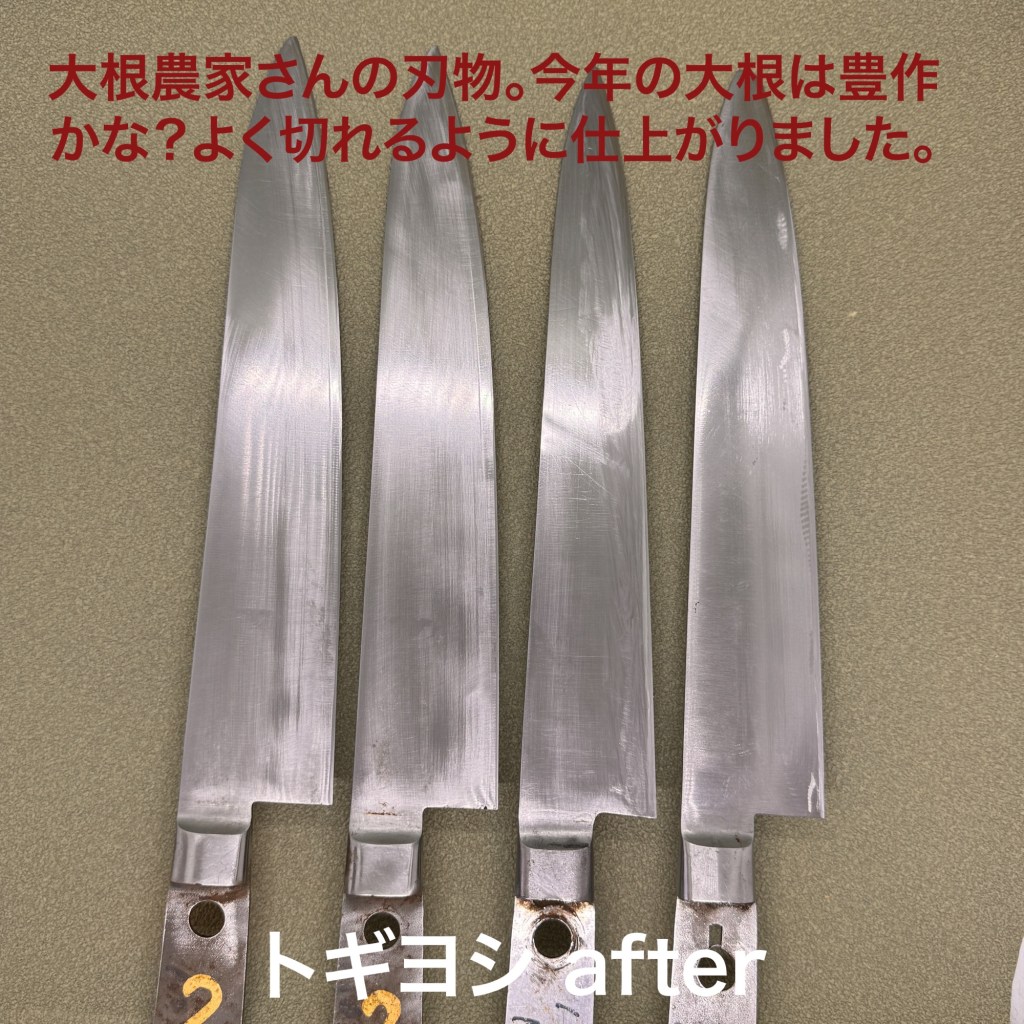 大根農家さんの刃物。機械に取り付けるので柄の部分が改造されています。毎日多くの大根の葉を落とします、土も付着しているので刃先の摩耗が激しい。しっかり落として仕上げました。この時期の風物詩となりました。今年もありがとうございます。