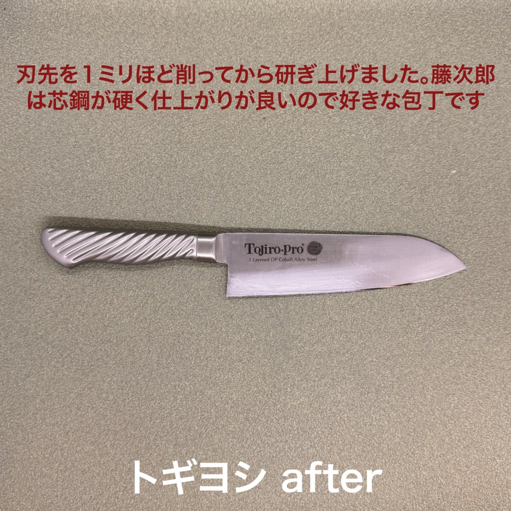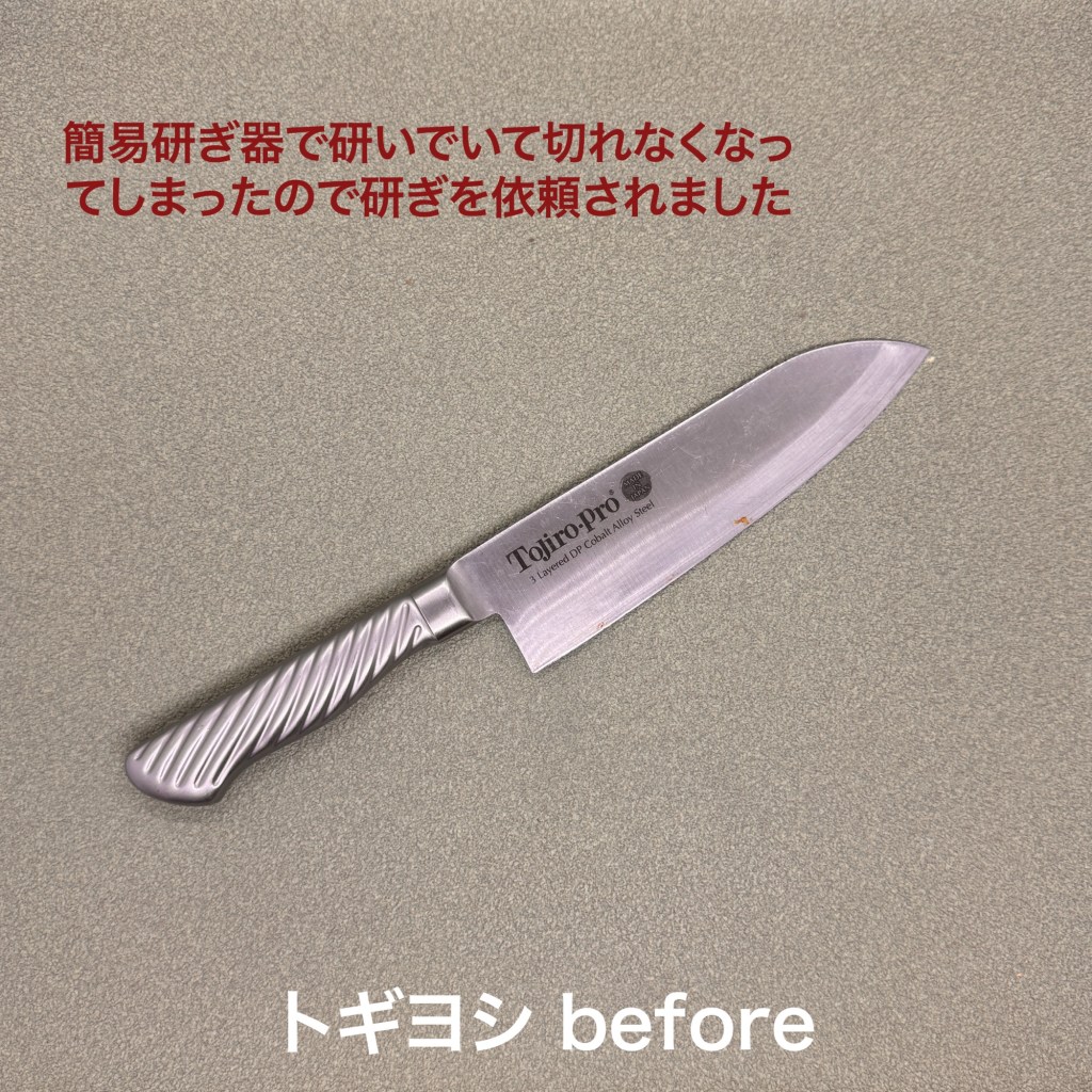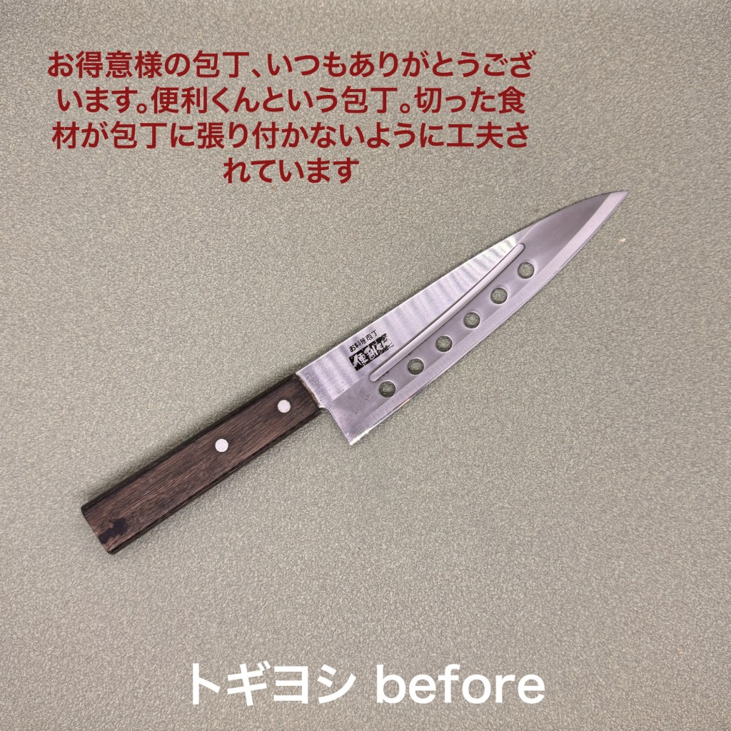 藤次郎の三徳包丁は普段簡易研ぎ器で研いでいて、全然切れなくなってとうのこと。錆が少しありますが深くはなくゴム砥石で簡単に消えました。刃先は欠けが何ヶ所かあり、荒砥で落としてから研ぎ上げました。便利くん包丁はお得意様の包丁、いつもありがとうございます。もう何度も研いでいて自分の形になっているのでとてもスムーズに仕上がりました。