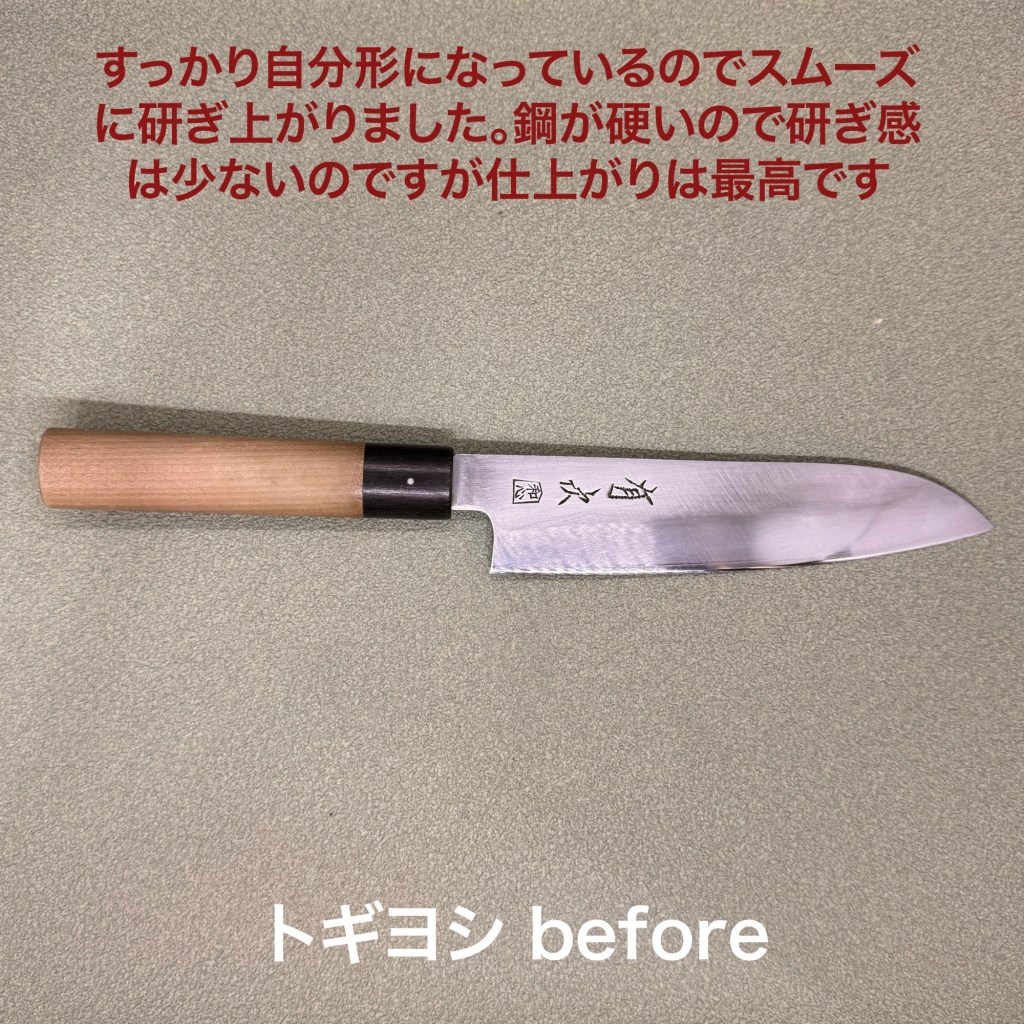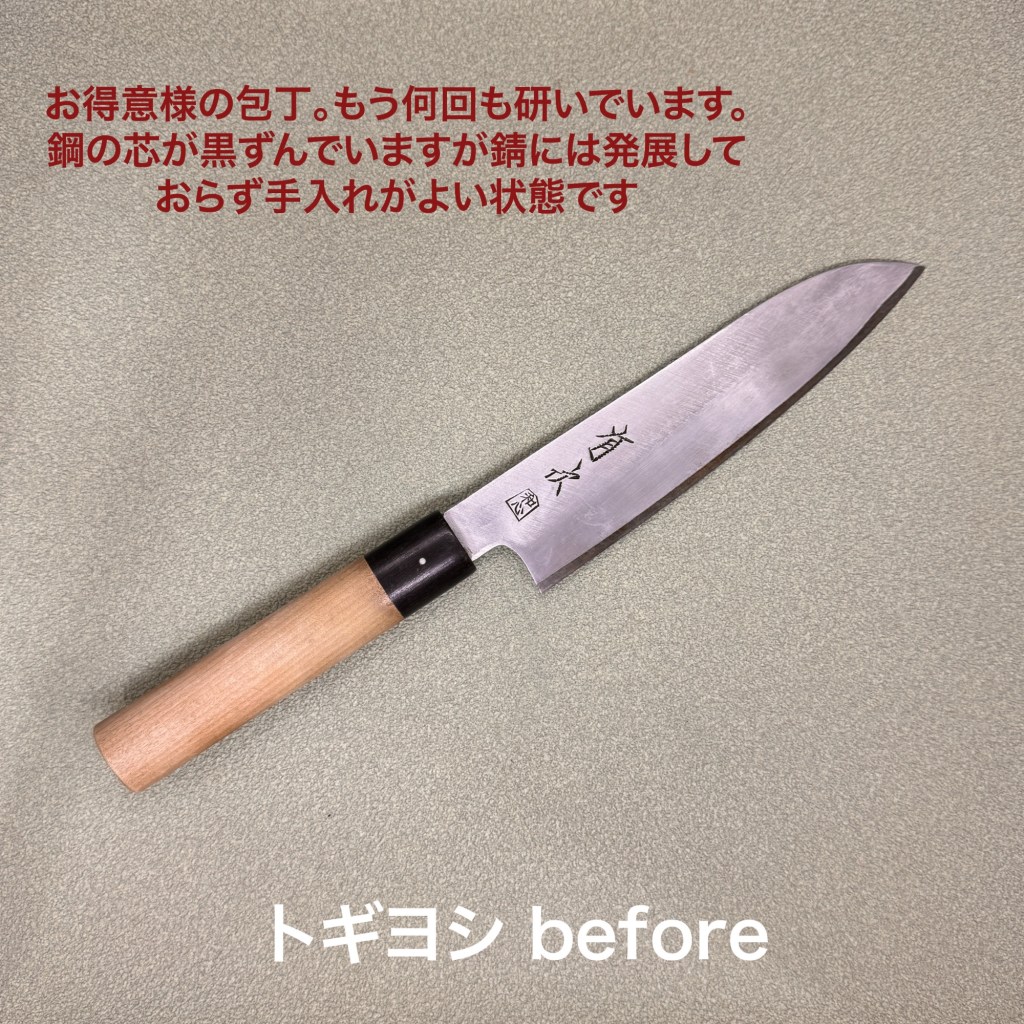 お得意様の包丁。いつもありがとうございます。もう何回目になるかな?それくら研いでいます。鋼の部分は黒ずんでいますが錆にまで進行していないので手入れは良い状態。研ぎの方は自分の形になっているのでとてもスムーズに研ぎ上がりました。毎回書いていますが、この包丁は芯の鋼が硬いので研いでいる感覚は薄いのですが、仕上がりは最高です!