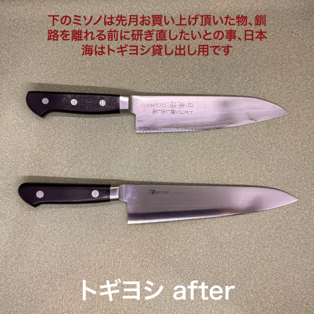 8月にお買い上げ頂いた包丁。釧路を離れるのでその前に研ぎ直したいとの事で初回無料券をご利用頂きました。刃先を見ると少し傷んでいます。また左利きの方なので左に寄せて研ぎ上げました。日本海の三徳包丁はトギヨシの貸し出し用包丁。お手元に包丁が1本しかなく料理ができない時にお貸ししていますので、どうぞご利用下さい。今回次のお客様に為にメンテナンスしました。
