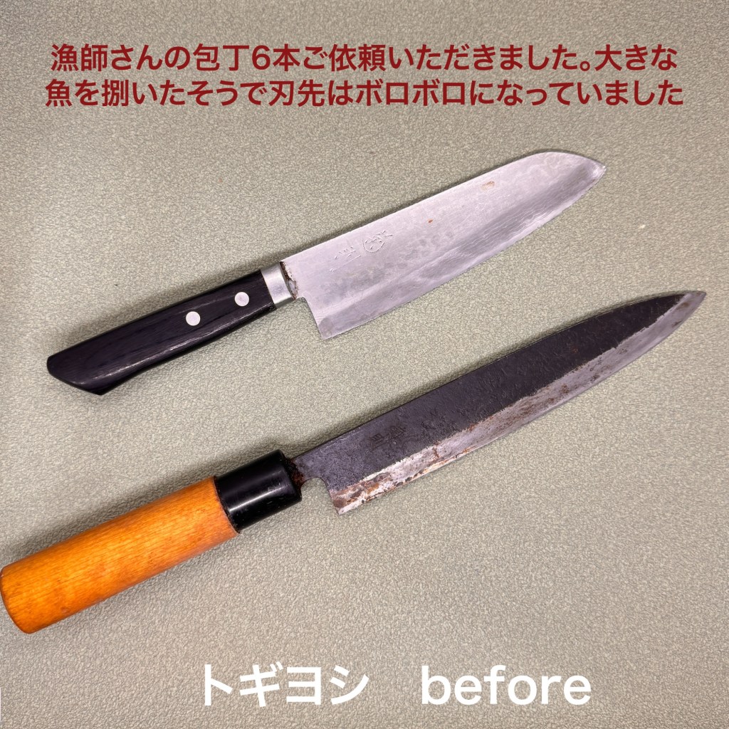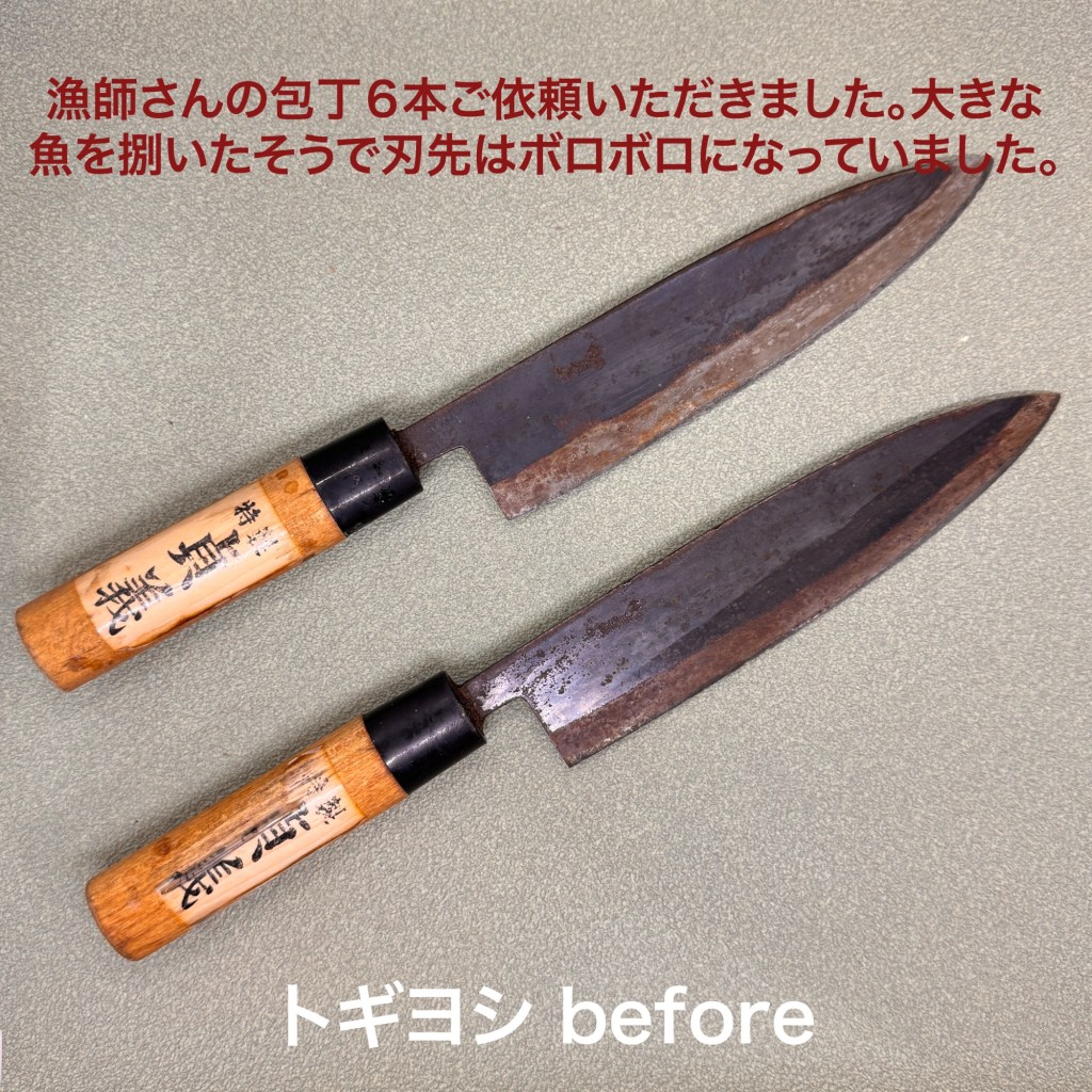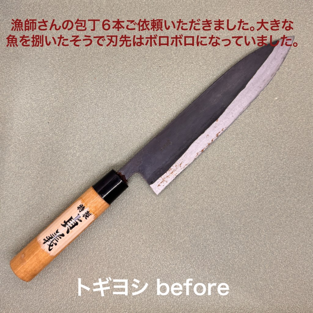漁師さんから6本の包丁研ぎを依頼いただきました。昨年も来釧された方で今年も大きな魚を捌いたそうで刃先はボロボロになって。大きな出刃は骨立つ時大きく欠けてしまった状態、ひたすら刃先を削って5ミリは落としたと思います。そこから切り刃の再生。角度は20度。だいぶ時間が掛かりましたが無事仕上がりました。両刃の舟行包丁は角度を測ったらVの角度が10度でした。それでは欠けやすいので、厚みを確保するため荒砥で刃先に0.5ミリ程残るように研いでから小刃を付けています。そうすることで厚み残るので欠け難くなります。両刃の和包丁は出刃を2回研ぐのと同じなので作業量も2倍(泣)次回から値上げします。