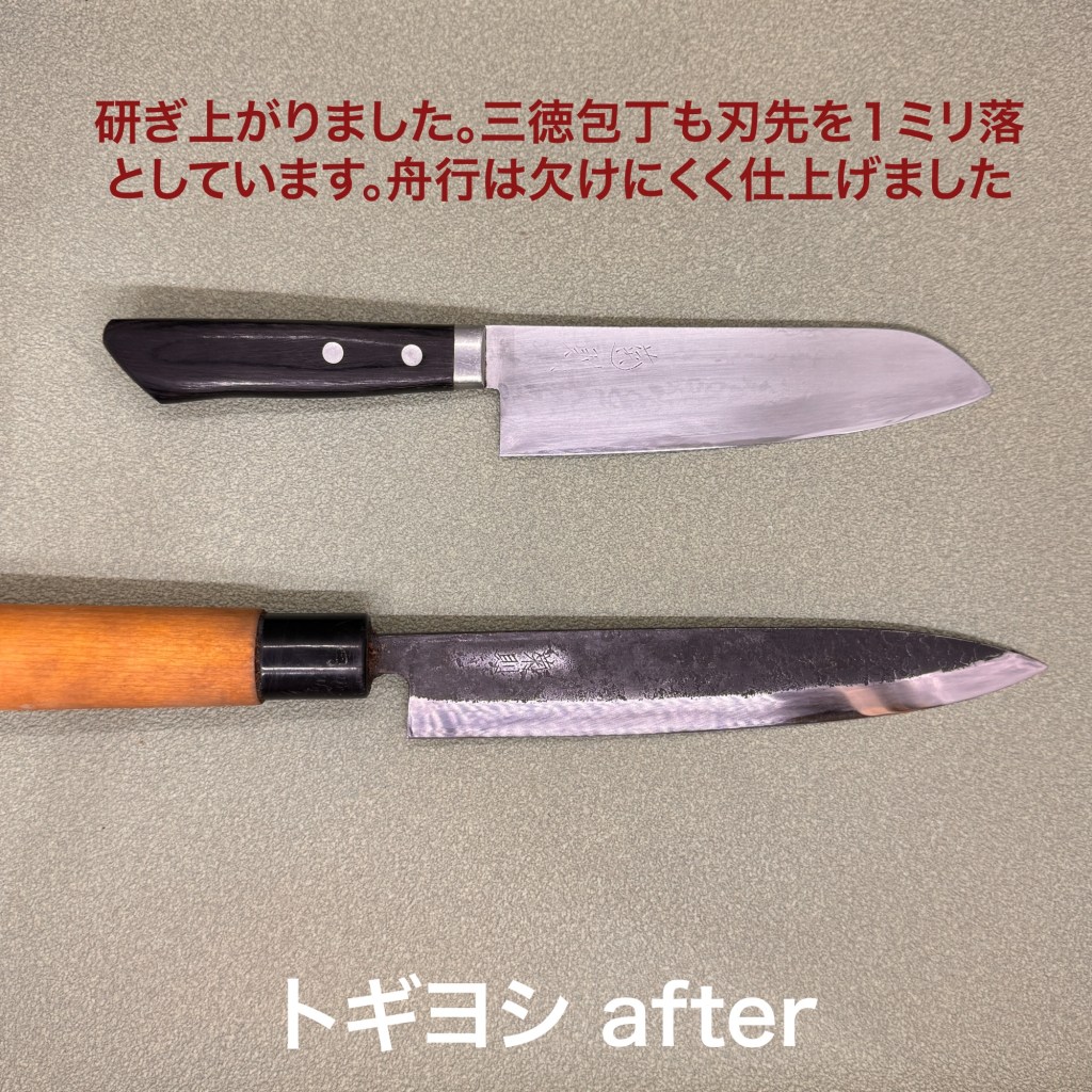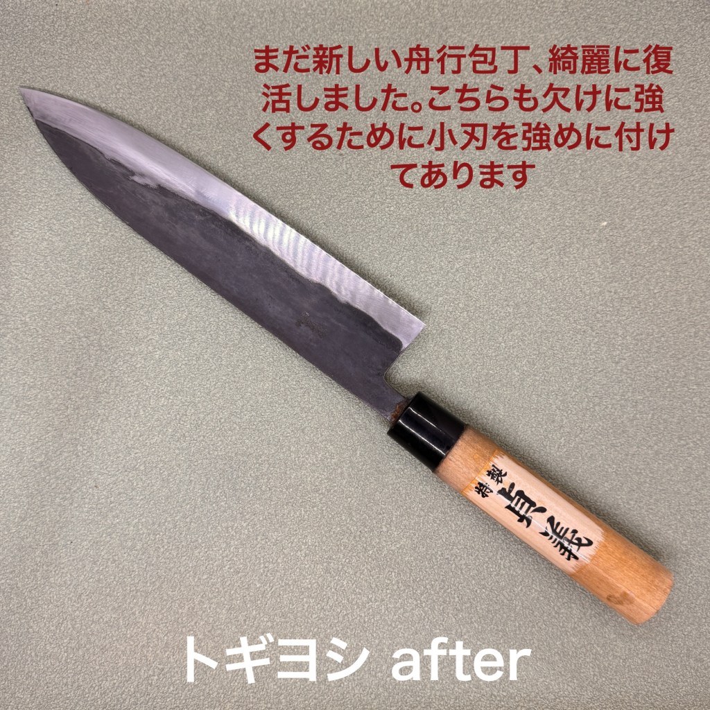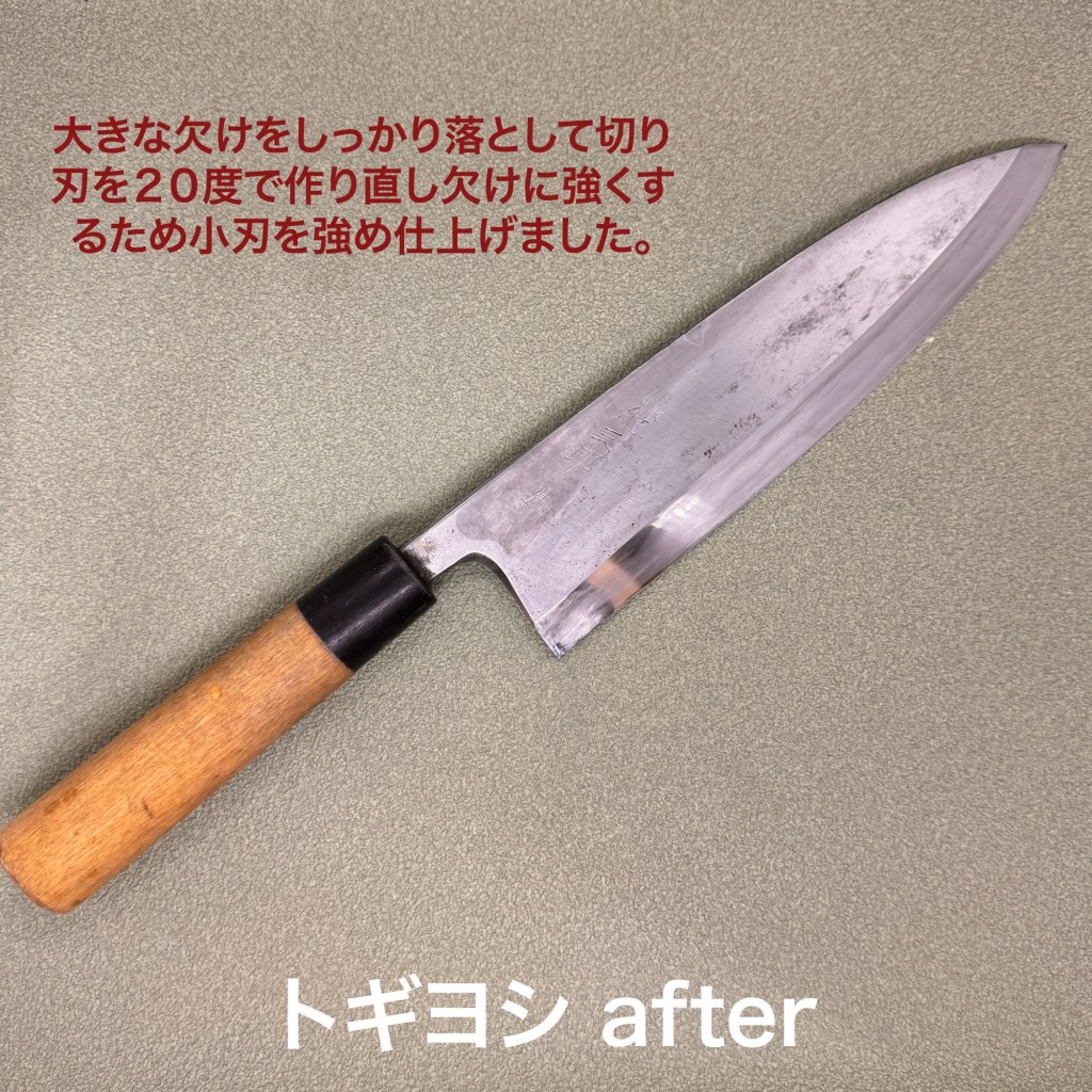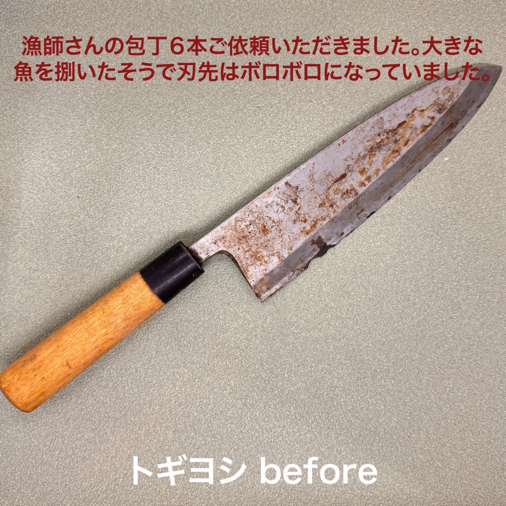 漁師さんから6本の包丁研ぎを依頼いただきました。昨年も来釧された方で今年も大きな魚を捌いたそうで刃先はボロボロになって。大きな出刃は骨立つ時大きく欠けてしまった状態、ひたすら刃先を削って5ミリは落としたと思います。そこから切り刃の再生。角度は20度。だいぶ時間が掛かりましたが無事仕上がりました。両刃の舟行包丁は角度を測ったらVの角度が10度でした。それでは欠けやすいので、厚みを確保するため荒砥で刃先に0.5ミリ程残るように研いでから小刃を付けています。そうすることで厚み残るので欠け難くなります。両刃の和包丁は出刃を2回研ぐのと同じなので作業量も2倍(泣)次回から値上げします。