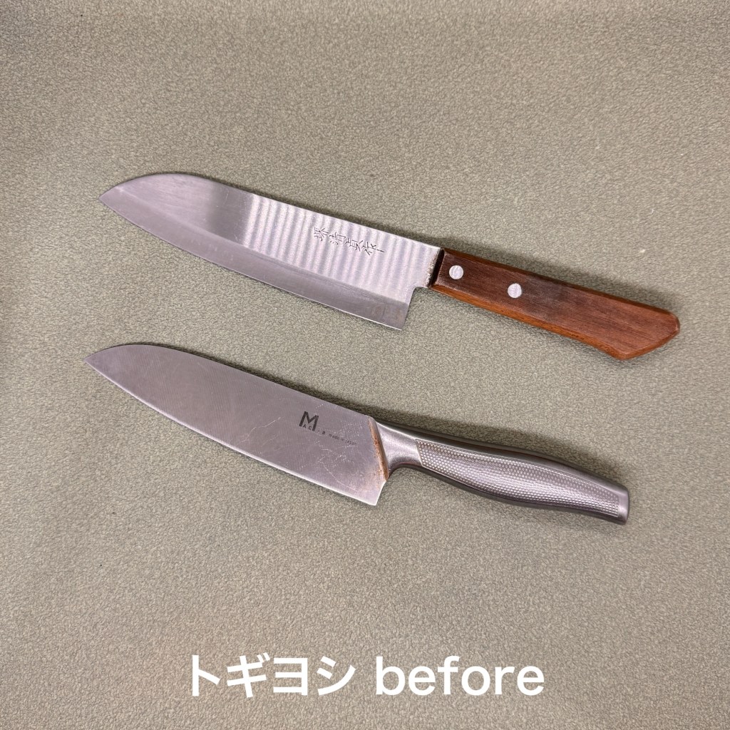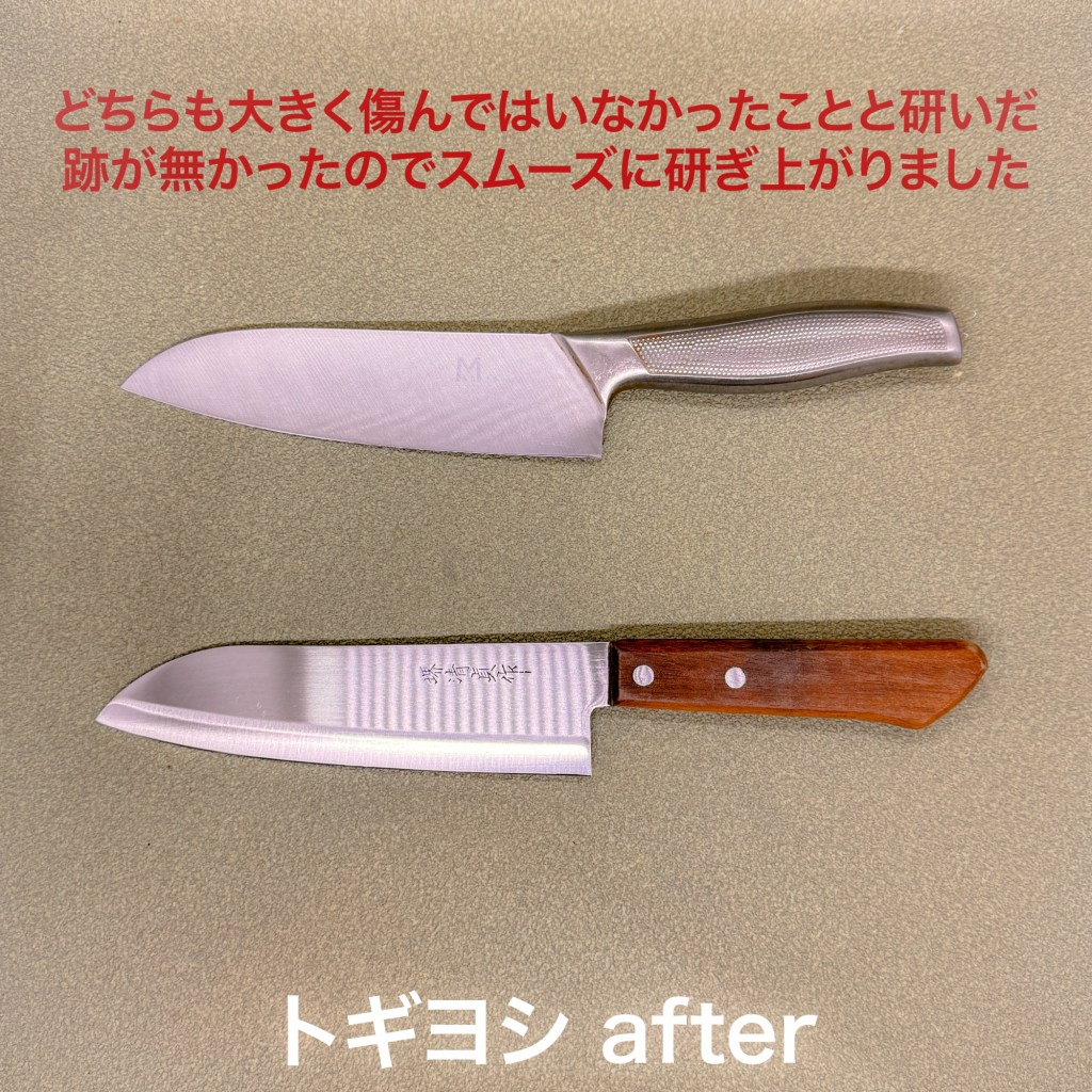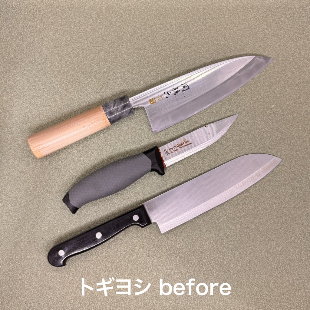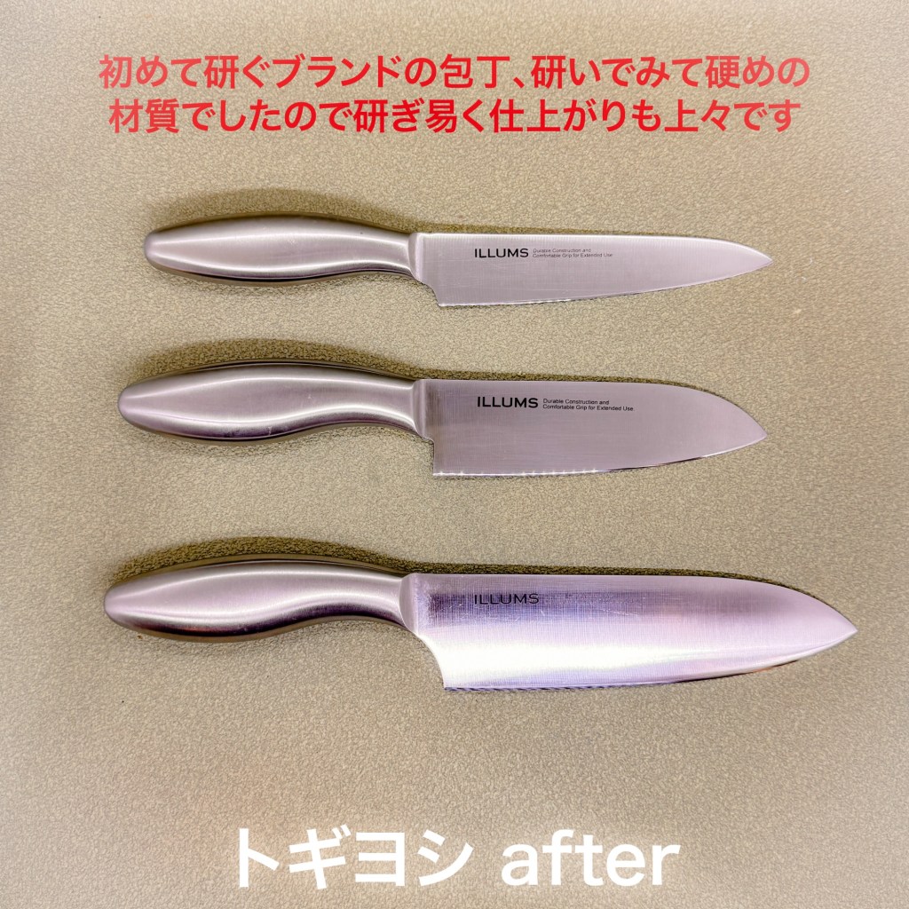 鹿肉に使っているというナイフと三徳包丁、出刃庖丁は鹿肉用に鈍角で仕上げました。でも出刃は魚用なので鹿肉には不向きなんです。ILLUMSの包丁3本は初めて研ぐブランド、研いでみたら材質も硬くて研ぎ易く仕上がりも上々でした。堺清貞とmac+aの三徳包丁は大きな傷みも無く研いだ形跡が無いのでスムーズに研ぎ上がりました。