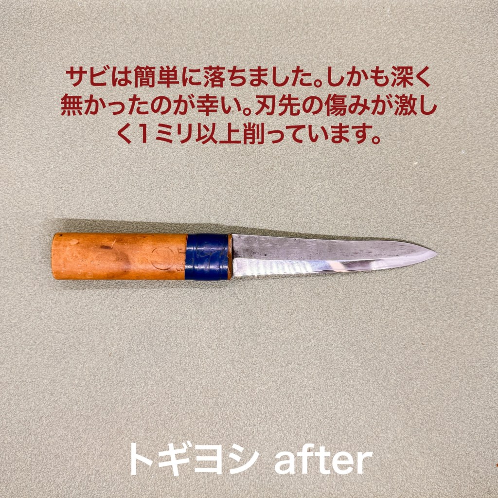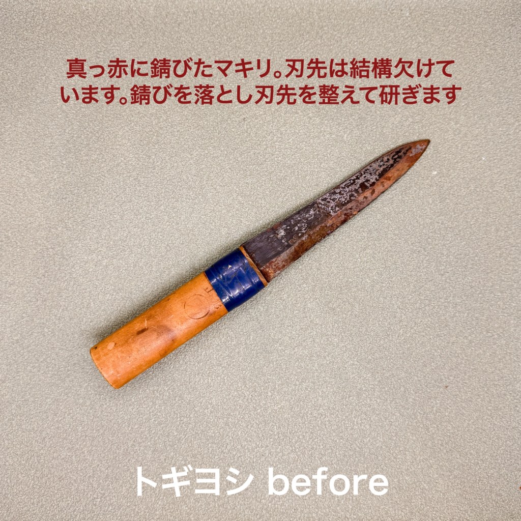 木屋の牛刀はお得意様の包丁、いつもありがとうございます。何回も研いでいるので自分の形になっているのでスムーズに仕上がりました。和之作の三徳包丁は左利き用に研がれていたのでそのまま仕上げました。宗隆の牛刀はクラッド割り込みなので鋼がセンターにあり、そこを片刃に研ぐと鋼を通り越えて裏の柔らかい地金が刃先に出てくるので切れません。仕方ないので裏も研いでしっかり鋼を出しました。真っ赤に錆びたマキリ。錆び落とし薬を使わないとダメかなと思ったけど削ったらすぐ落ちました。刃は結構荒れていて1ミリほど落としています。綺麗に仕上がったでしょ。3本出してくださったのはこれから飲食店を開業される方、おめでとうございます。開業前に包丁を整えたいとの事。さらにできるだけピカピカにとうことで、頑張って磨きました。刃先は片刃で刃線が綺麗では無かったので整えて仕上げました。小出刃はちょっと困った状態。裏スキが完全なくなってしかも中央が盛り上がっています。とりあえずフラットに戻して様子を見ます。