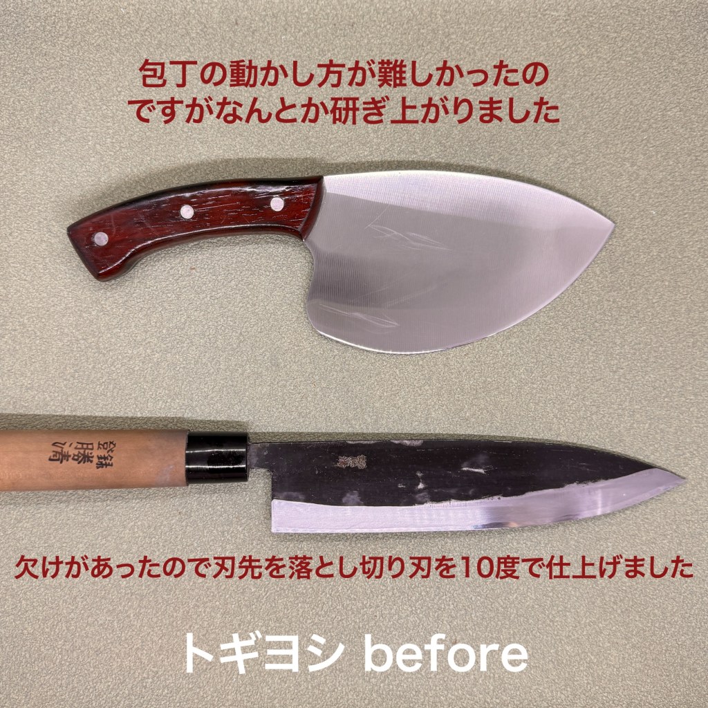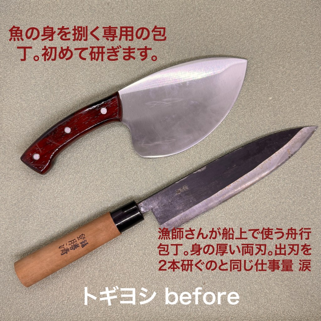 先日も研いだ舟行包丁。出刃包丁2本分の作業量になります。刃先が骨に当たったのか2箇所凹んでいましたので削り落としてから切り刃を10度で研ぎ上げました。