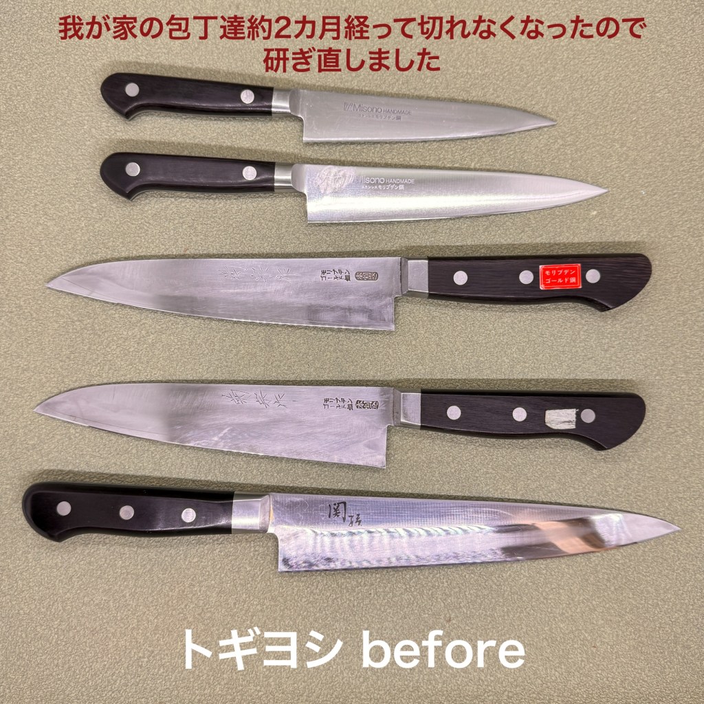 続いて我が家の包丁達。研ぐのは2カ月ぶり、トマトもスッと切れなくなっていました。ただ大きな傷みは無いので刃先の調整だけで仕上がりました。