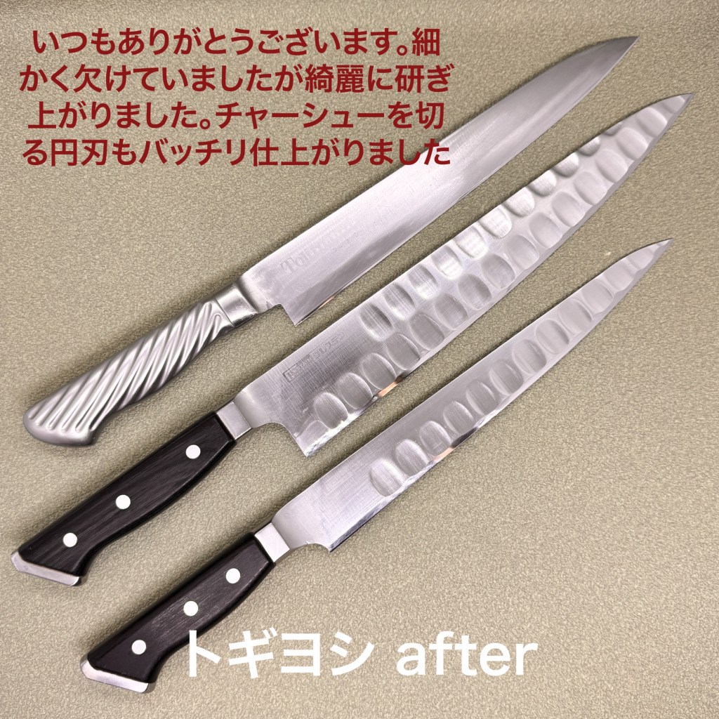 大きな包丁3本は麺屋武双さんの包丁。いつもありがとうございます。少し欠けいましたが問題にならず仕上がりました。あとスライサーの円刃研ぎもご依頼いただきました。こちらは結構欠けていて、まず円周に沿って欠けを落とし、縦型水研機の角度と位置を合わせて仕上げました。