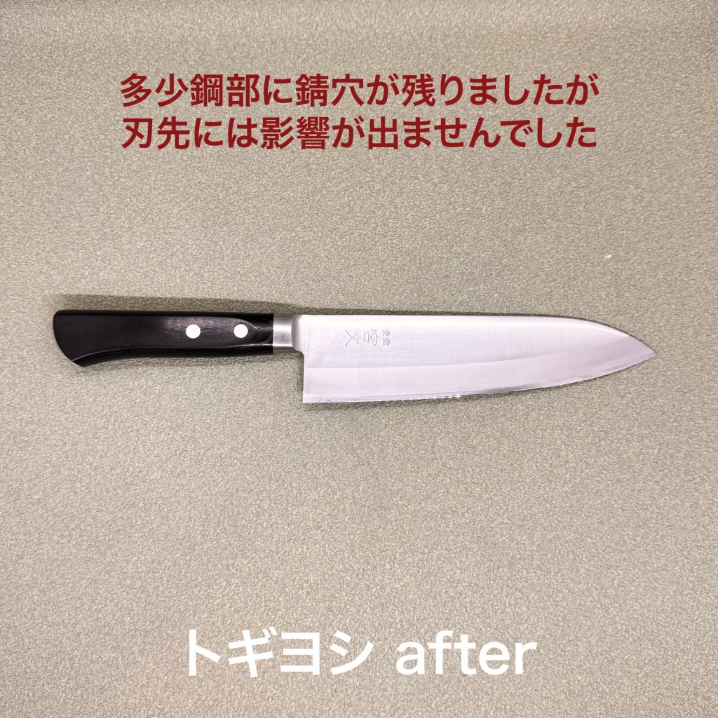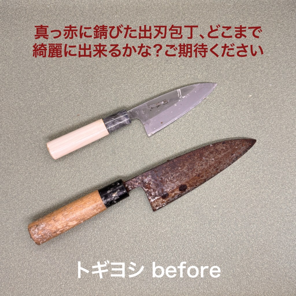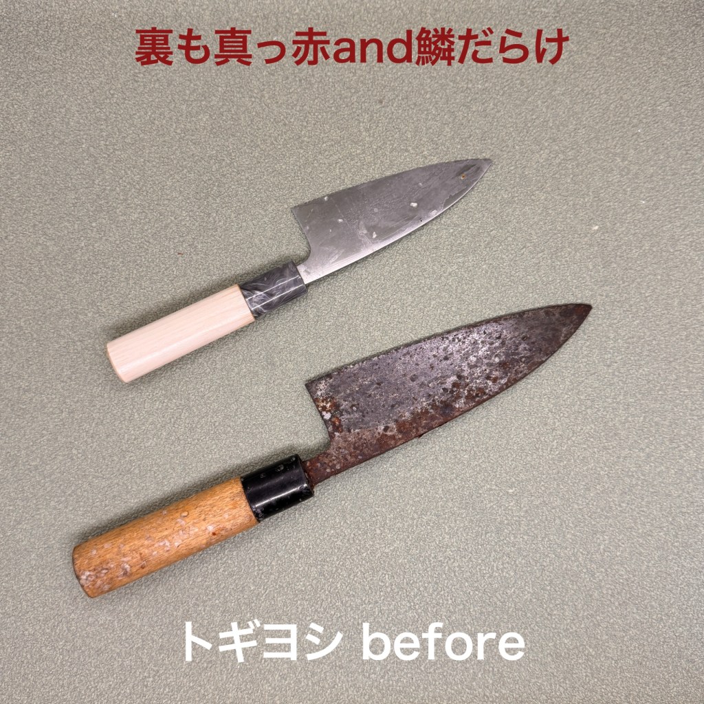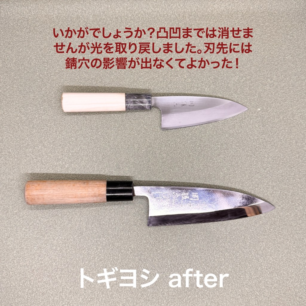真っ赤に錆びた出刃包丁とステンレスのアジ用出刃、どちらも鱗が残っていて落してから研ぎ始めます。魚を切ったら包丁は洗って下さいね。3mのCNSベベルブラシ三種類でサビを落とし白研で磨きました。切り刃も20度鋭角になっていたのでその角度に合わせて仕上げました。刃先に錆びの影響はでず良い仕上がりになりました。