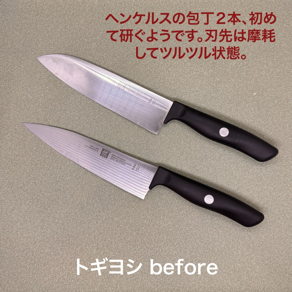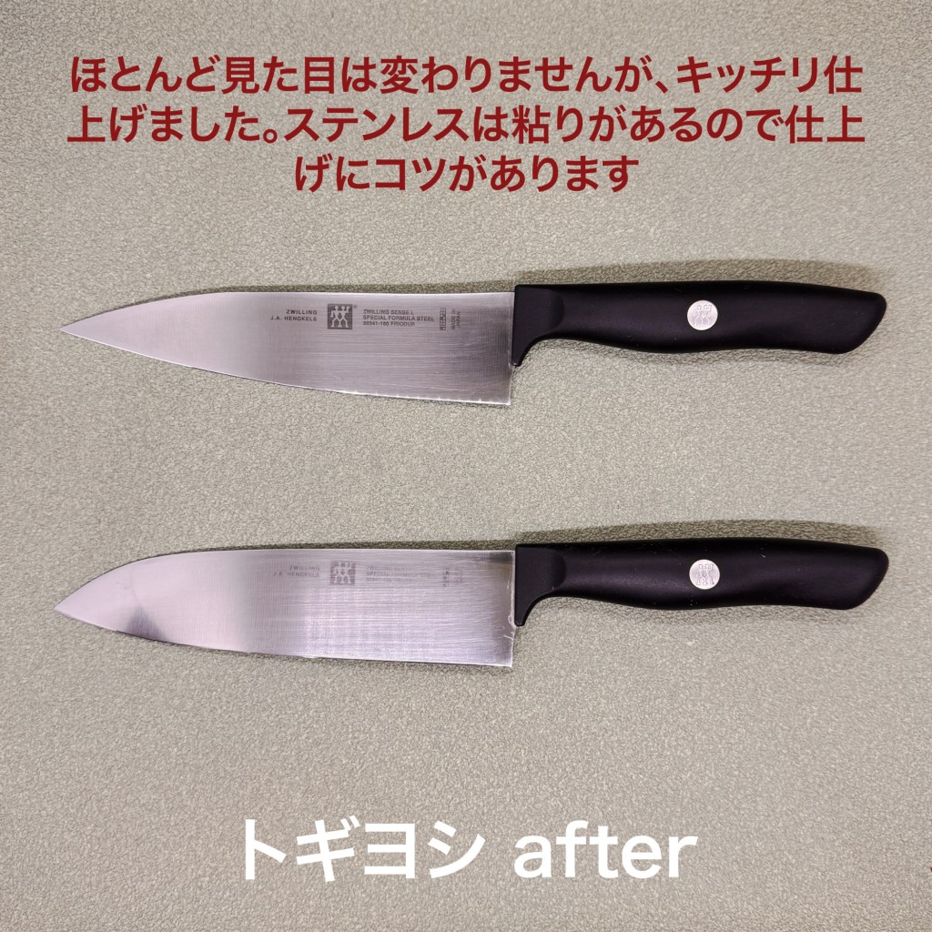 ヘンケンルスの牛刀と三徳包丁は研いだ痕が無いので初めて研ぐようです。刃先は摩耗が進んで切れないのを我慢されている状態でした。ステンレス鋼は粘りが強い鋼なのでカエリを落とすのに苦労しますが無事仕上がりました