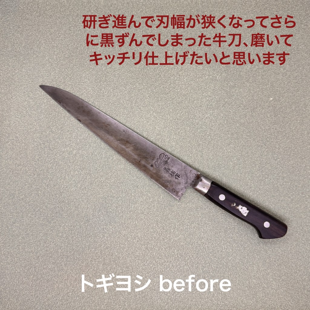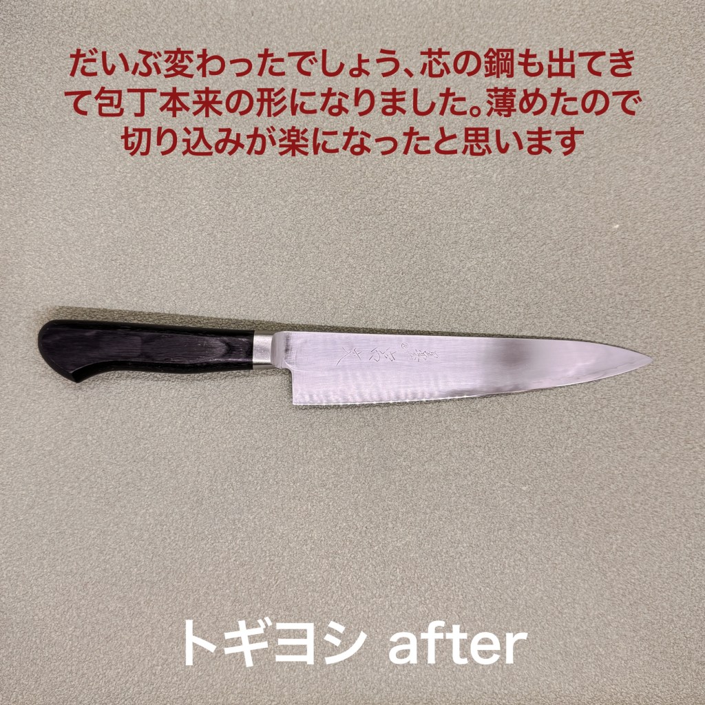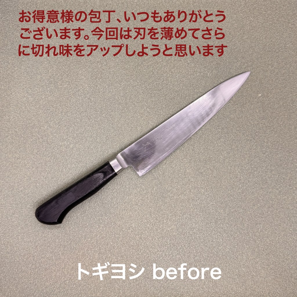 宮文の牛刀はお得意様の包丁だいぶ身が厚くなったので薄めました。隠れていた刃線も出てきて本来姿に戻りました。もちろん切れ味も。