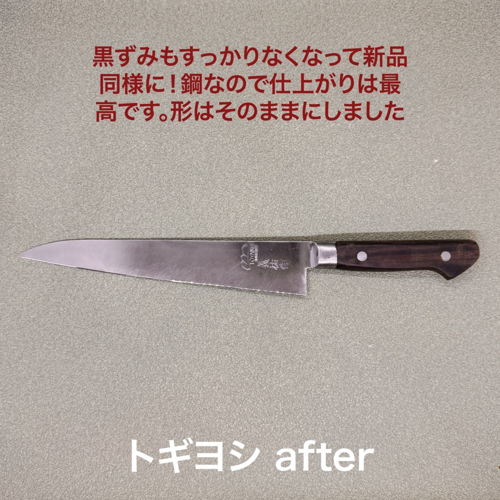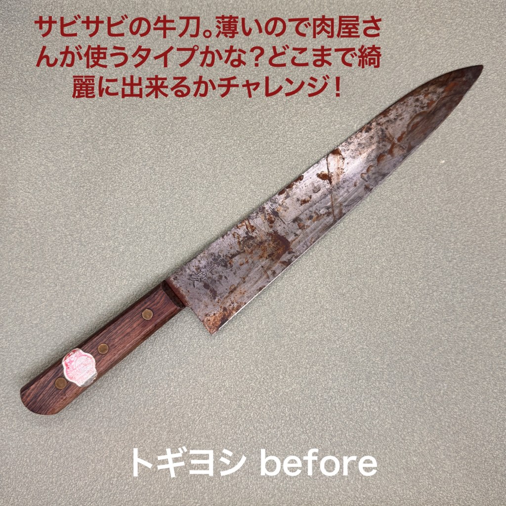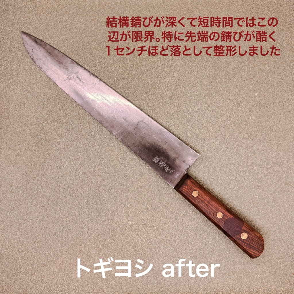 義祐作の牛刀は研ぎ進んで刃先が真っ直ぐになっているのは本来の形に戻すことも可能ですがご指示が無かったのでそのままで仕上げました。黒ずんでしまっていますが錆びは少なく良い状態でした。