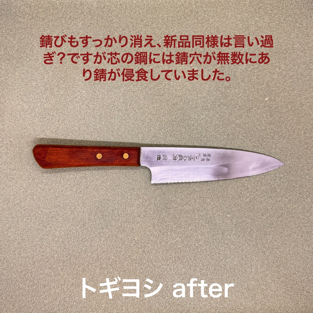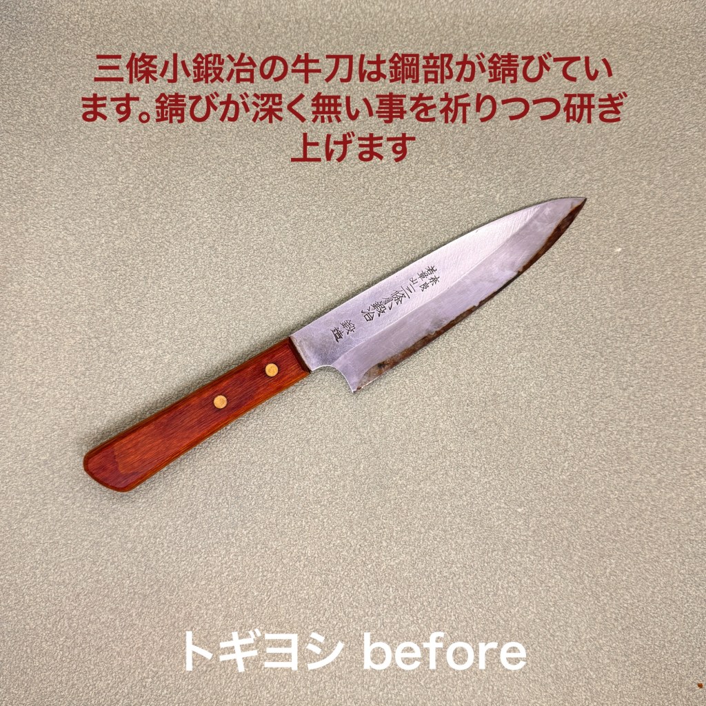 奈良修学旅行の定番土産 三條小鍛冶の包丁。皆さん思い出深い包丁なので大切に使われています。残念ながら鋼なので錆びが発生します。よく乾かす。変色したら磨く、これしか錆びさせない方法はありません。