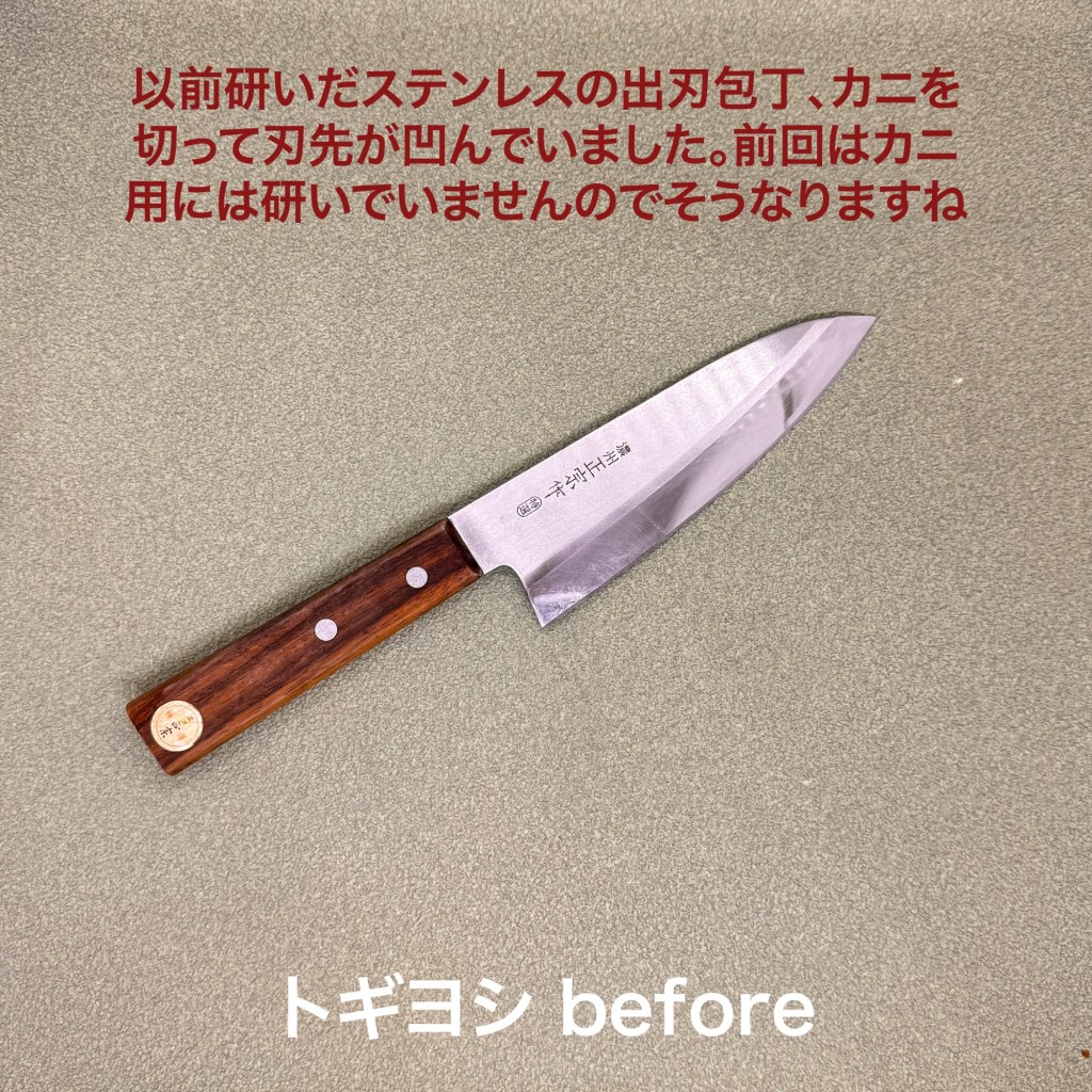 濃州正宗のステンレス出刃包丁はとても硬い材質。ステンレスでここまで硬いのは珍しい。前回研いだのは魚用。カニを切って刃先が凹んため持ち込まれました。カニなどの硬いものを切るときは刃先の角度が違います(鈍角)今回はは硬いもの様に30で小刃を付けました。魚の身おろしには不向きです。