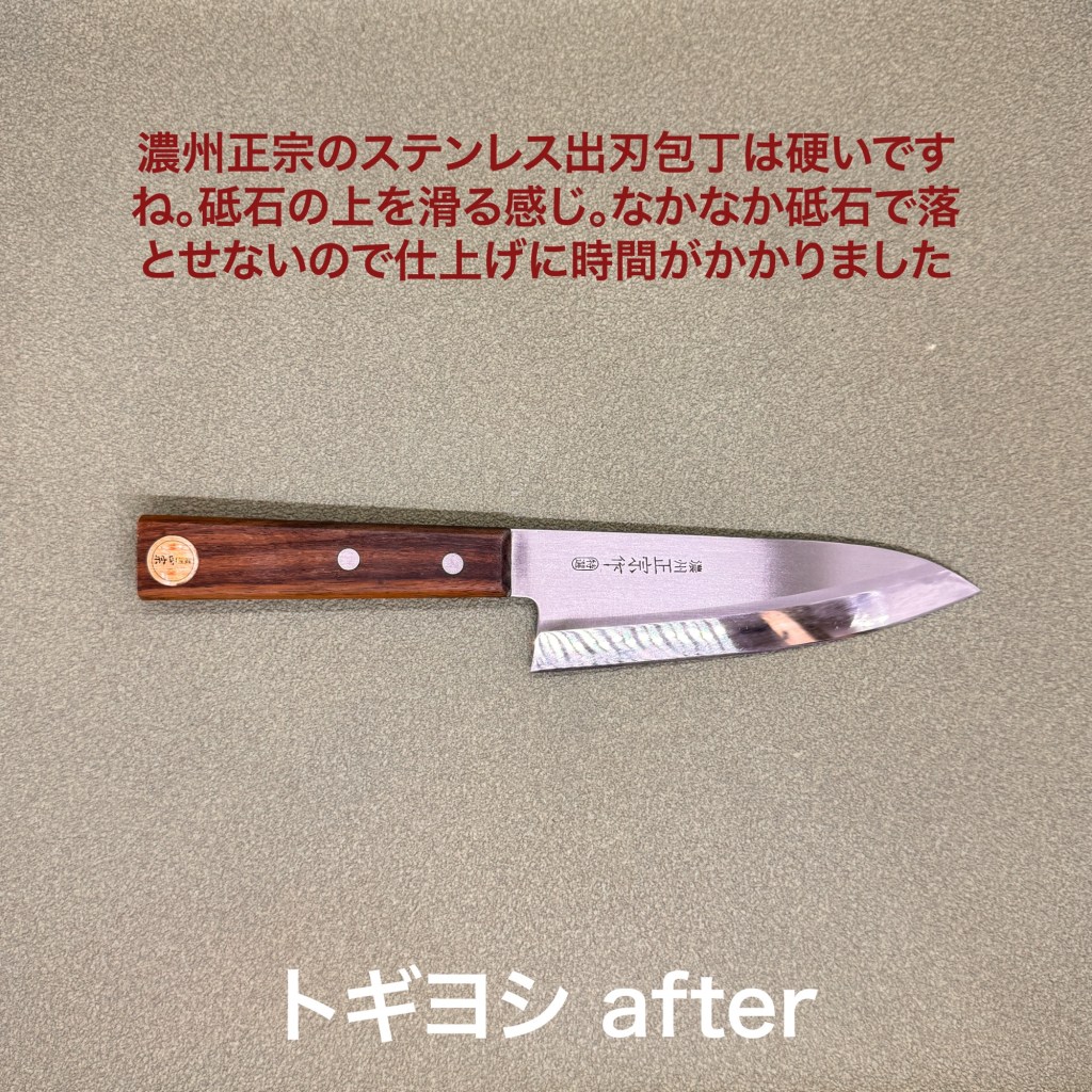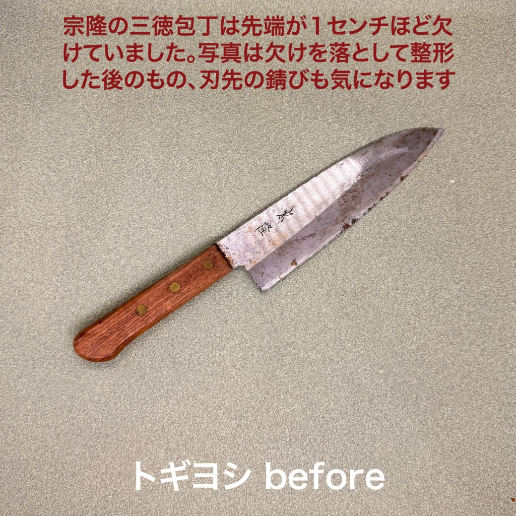 宗隆の牛刀は全鋼でした。その事もあって欠け易いため切先が大きく1センチ以上欠けていました。荒砥でガリガリ削って整形し研ぎ上がりました。欠けてもトギヨシ料金は変わりません。