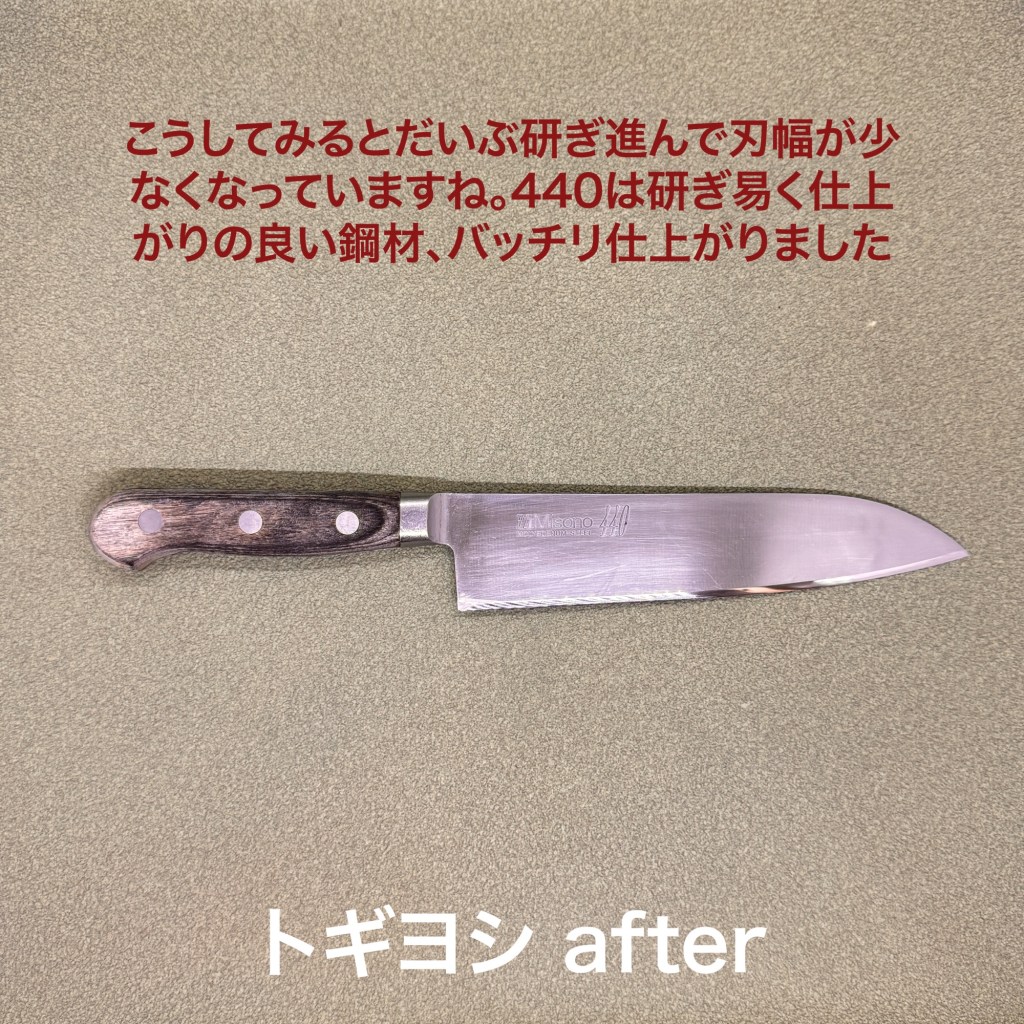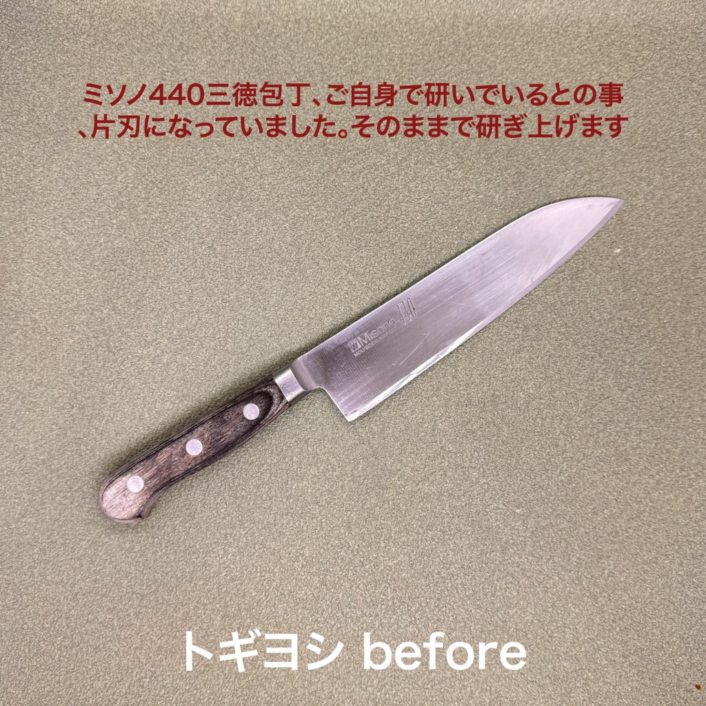 ミソノ440の三徳包丁はご自身でメンテされた包丁。だいぶ研ぎ進んで刃幅が狭くなっていますね。刃は片刃に研がれていたのでそのままで研ぎ上げました。柄がしらちゃけているのは食洗機に入れているから。包丁は食洗機には入れないでね。