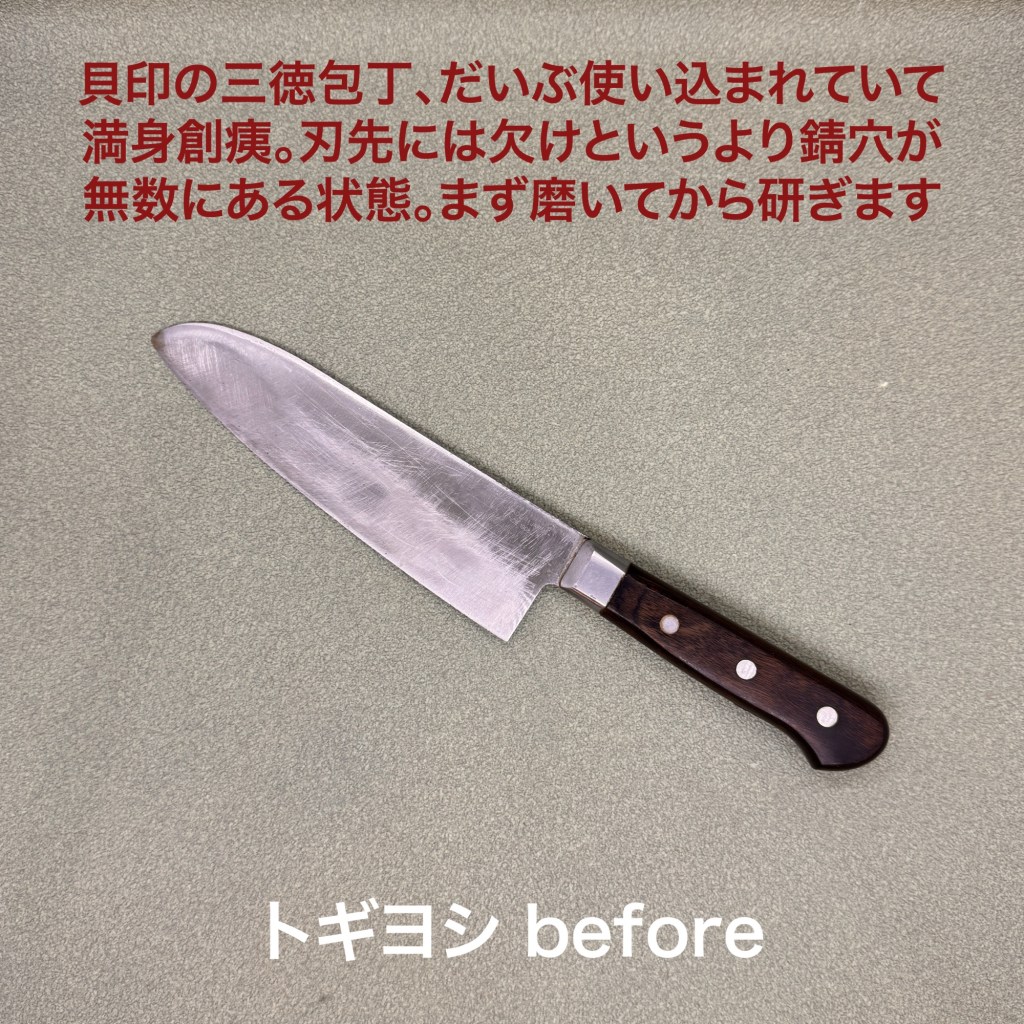 貝印の三徳包丁は永く使われていて満身創痍。傷も無数、背はかぼちゃ切る時に金槌で叩いて凸凹、刃先は欠けというより錆穴がたくさん、まず磨いてから研ぎ上げました。かぼちゃは切先から差し込んで皮に沿って切って行くと切り易いと思います。