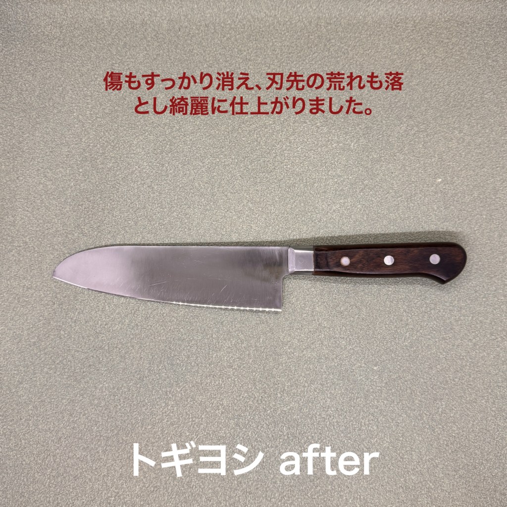 トギヨシ貸し出し用包丁の日本海は、だいぶ刃身が厚くなってしまったので薄めて研ぎ直しました。これで更に切り易くなったと思います。