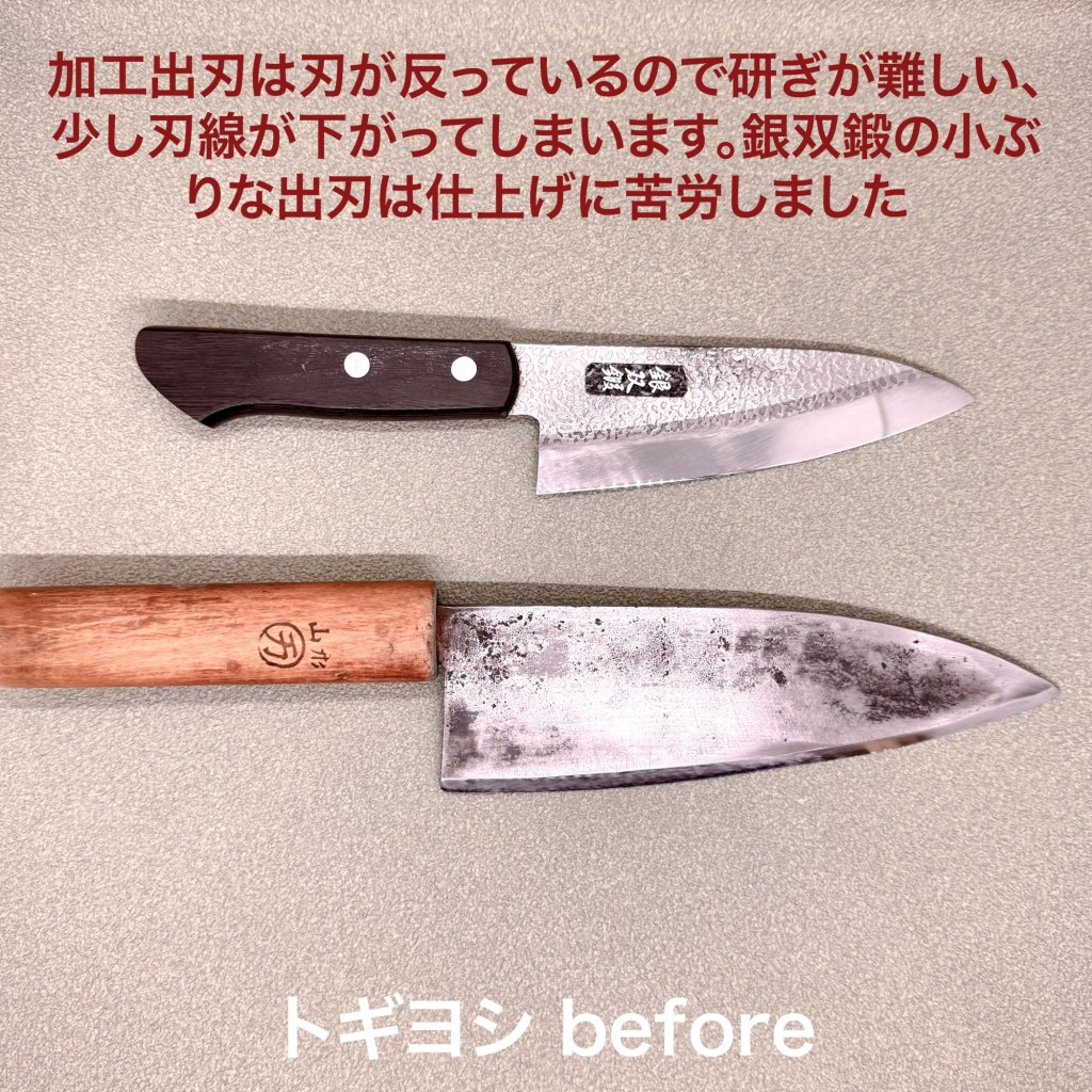 銀双鍛の小ぶりな出刃はステンレス鋼です。ただカエリが落ちにくくて仕上げには苦労しましたが、ピカピカに仕上がりました。加工出刃は嫁入り道具として持してくれたそうです。それから60年大切に使われていて錆びが一切ありません。サビのない加工出刃を見たのは初めてかもしれなません。たぶん。