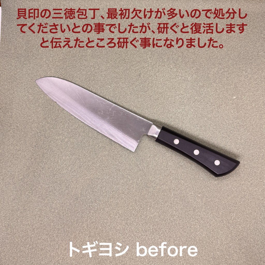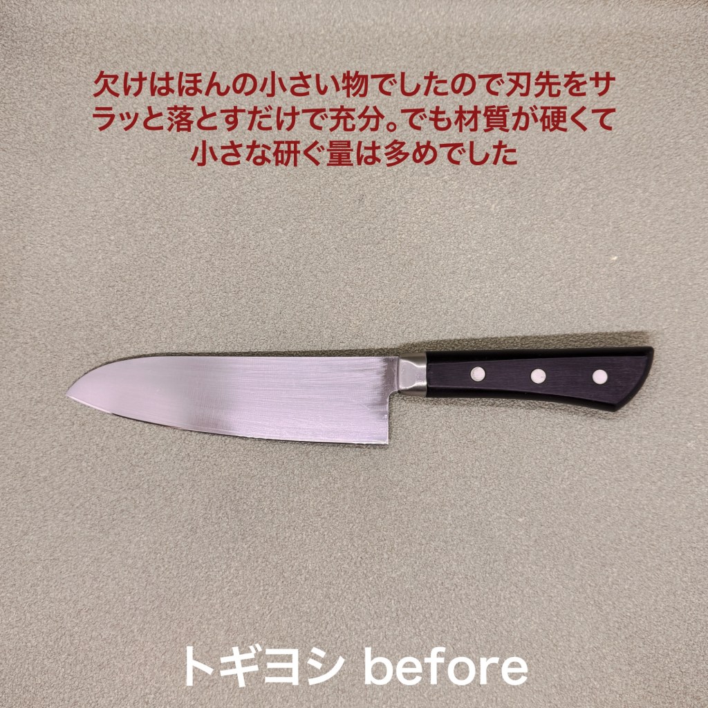 kaiの三徳包丁は刃先がボロボロになっているので処分していただけますかという会話から始まりました。でも一度も本格的研いだ跡が無いので研いだら復活しますとお伝えしたところ研ぐ事に。1ミリくらい刃先を削ってから研ぎ上げましたが材質が硬くて刃の黒幕#220でもなかなか落とせませんでした。