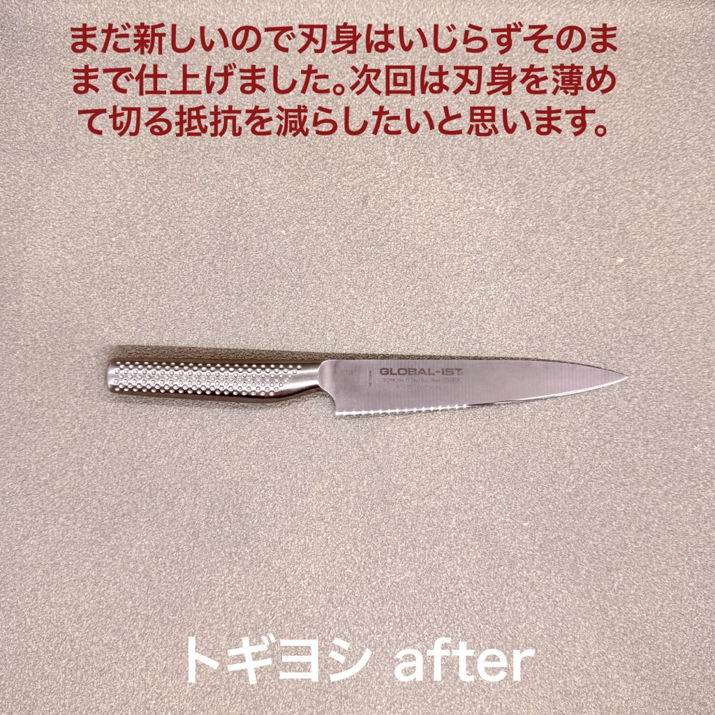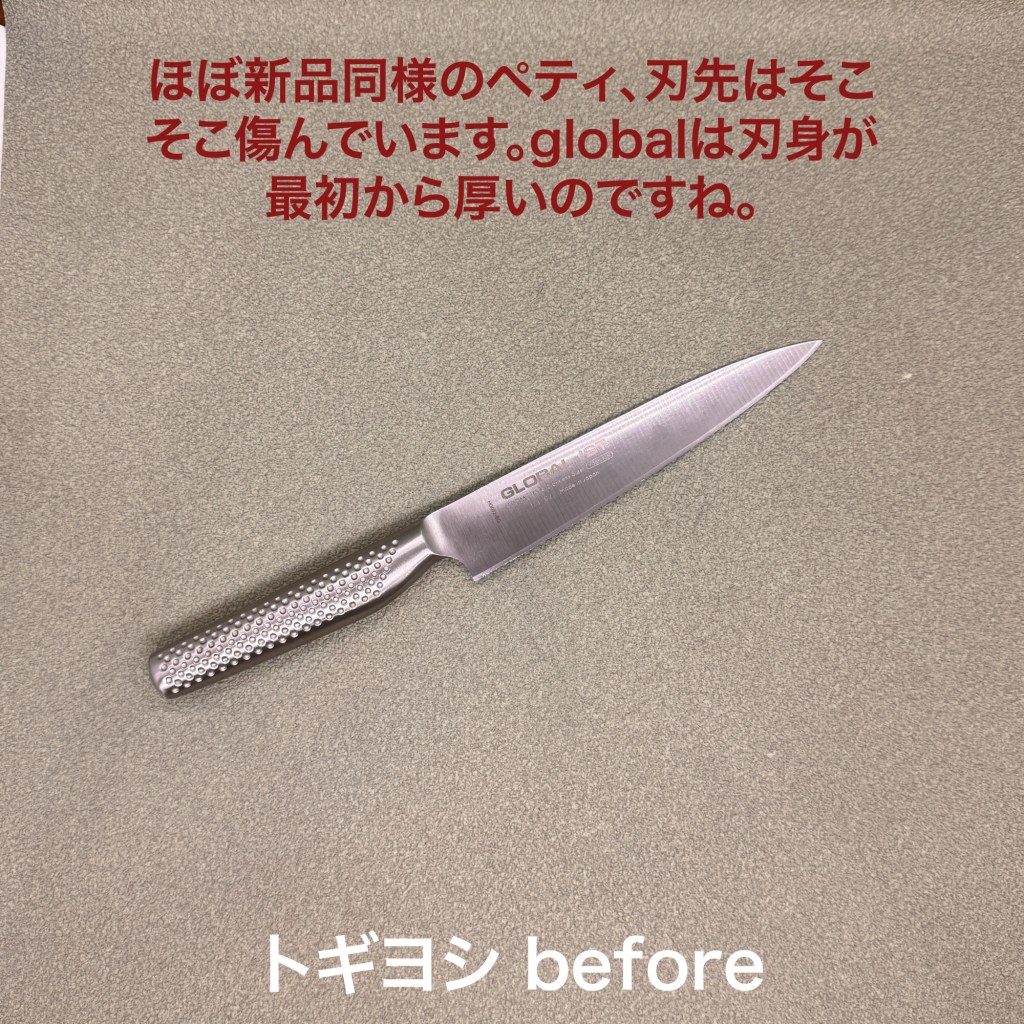 globalのペティはほぼ新品ですが刃先は傷んでいましたので元々の角度のまま研ぐ事に。globalの包丁は刃厚が刃先まで同じ構造。ペティは判るのですが三徳も牛刀もその構造。個人的には切れ味が高いとは思えないのですがメーカーの目的があるのでしょうね。