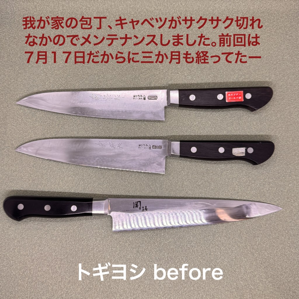 我が家の包丁。昼にキャベツを切ったら滑って切りにくかった。という事で3ヶ月ぶりのメンテナンス。まな板が硬めのプラスチック製なので持ちが悪い例です。(≧∀≦)
