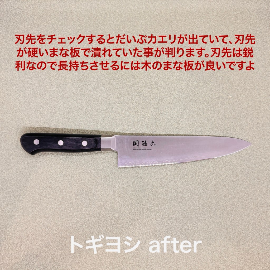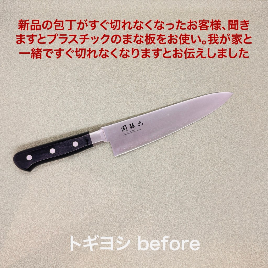 関孫六の牛刀は、新品を買ったけどすぐ切れなくなったとの事で研ぎ依頼。聞くとプラスチックの硬いまな板を使っているとの事で我が家と一緒。それは切れ味が長持ちしませんとお伝えしました。