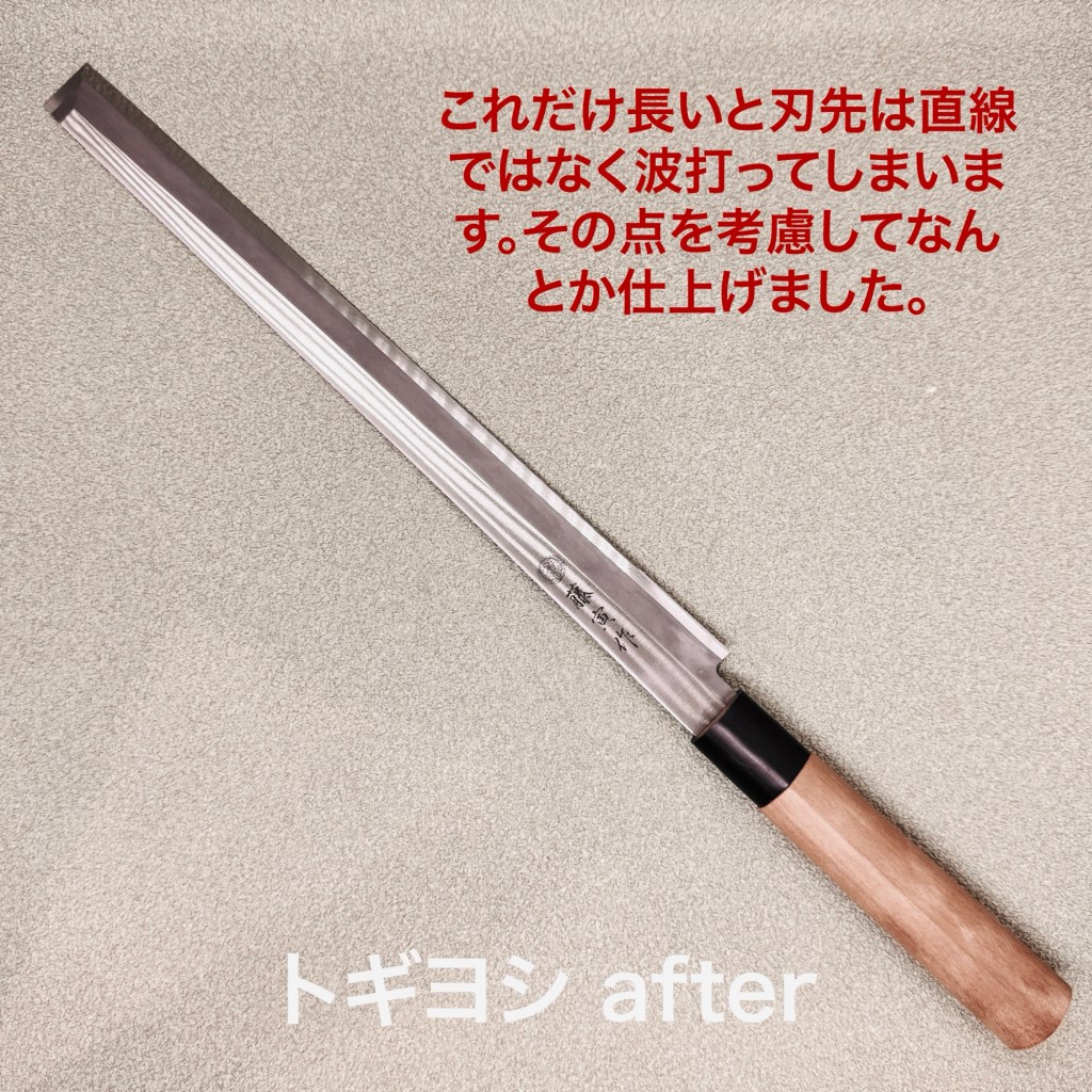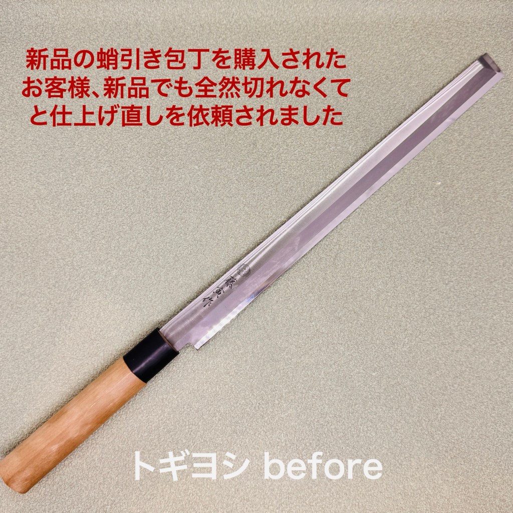 藤虎の蛸引きは新品で購入して切れ味が今ひとつとう事で仕上げ直しのご依頼。これだけ長いと刃先の直線性も出にくいの少し波打ちます。その事を考慮しながら研ぎ上げました。