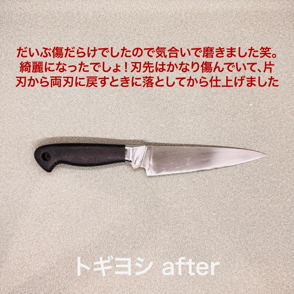 小ぶりなシェフナイフは初めての研ぎ、ありがとうございます。手元の出っ張りが特徴のシェフナイフは研ぎにくい刃物。裏は削ってあったので表も削り落としてから研ぎ上げました。傷も多かったのでかなり磨き込みましたよ